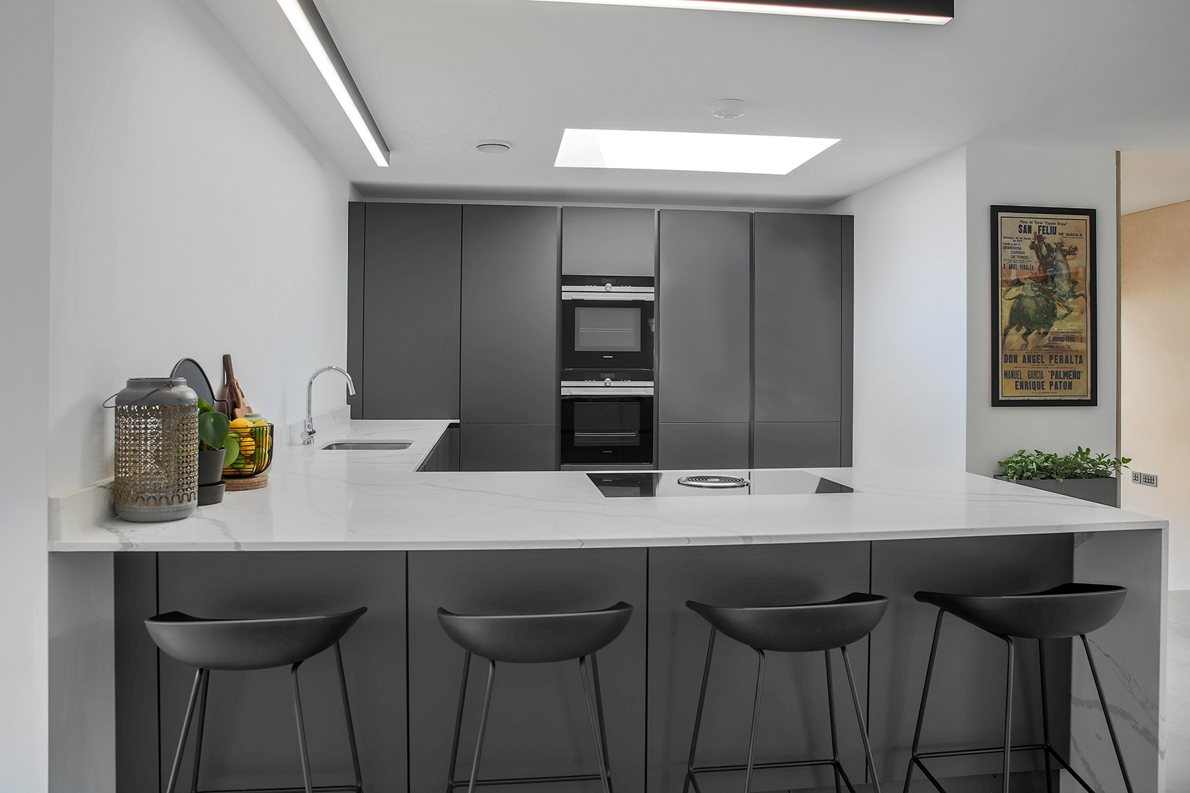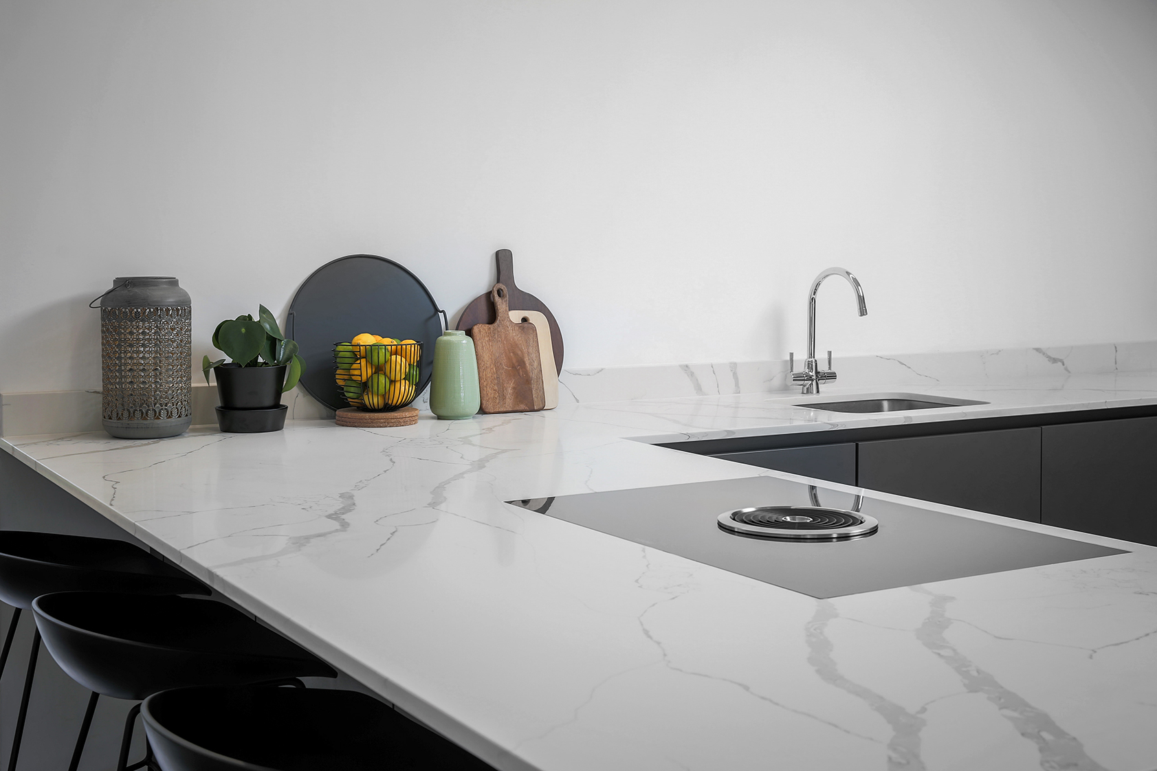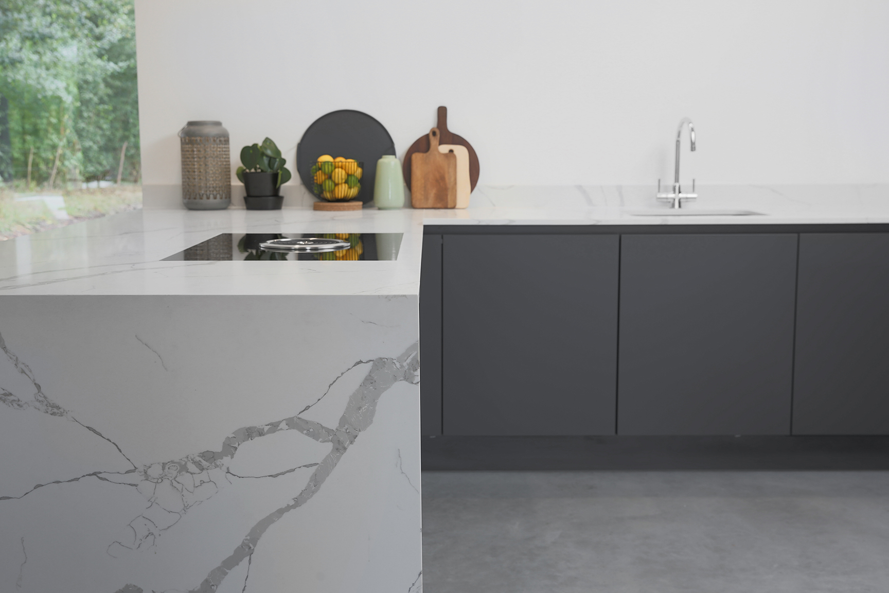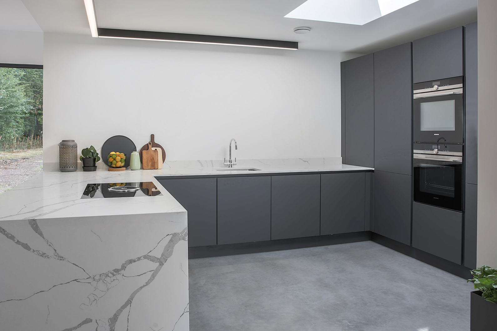 Inspired by minimalist design, this carbon grey handle-less kitchen is the perfect addition to a contemporary lifestyle. Subtle and sleek, this design enjoys a unity of simple elements. From muted shades to neat lines, it represents the best of modern architecture.