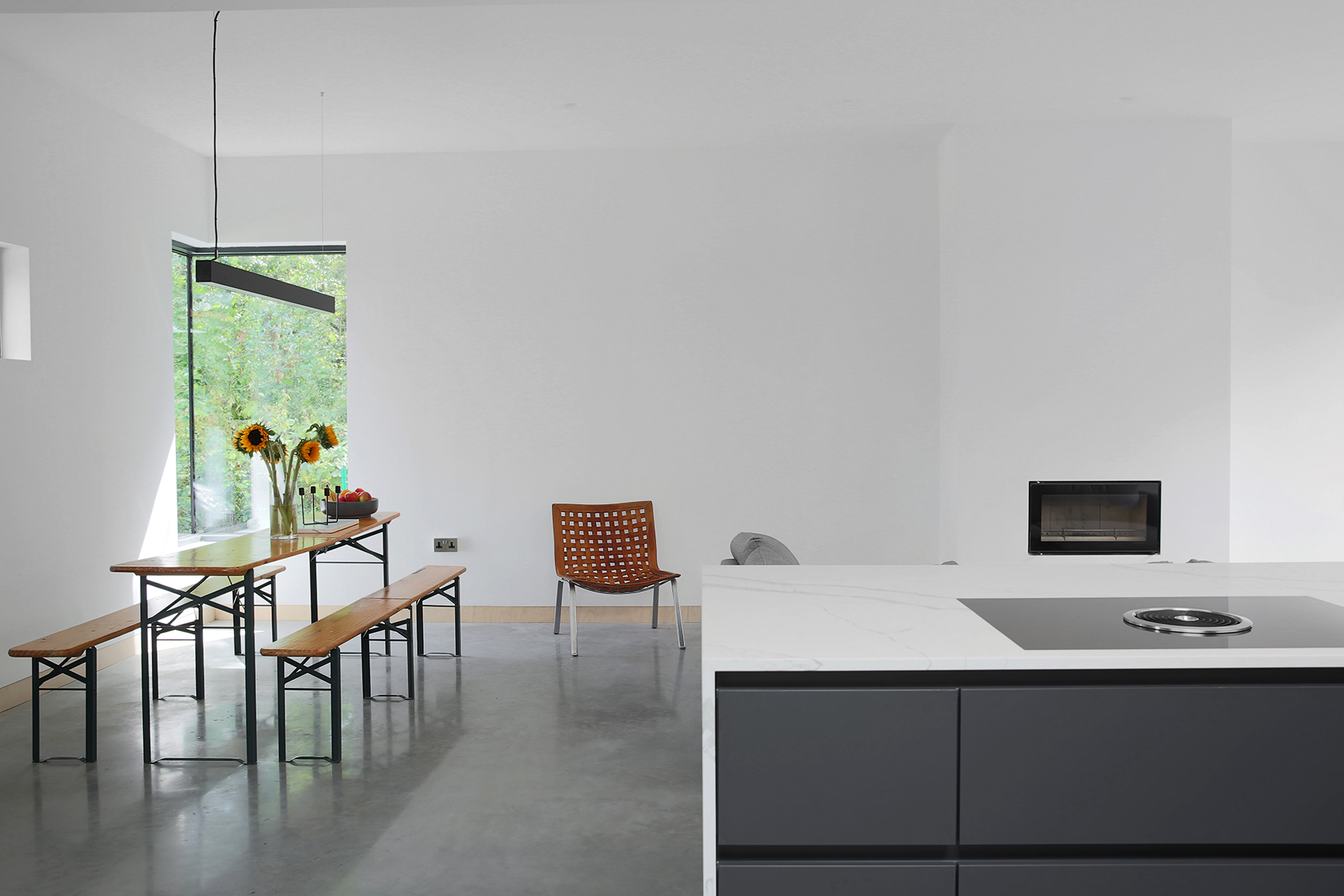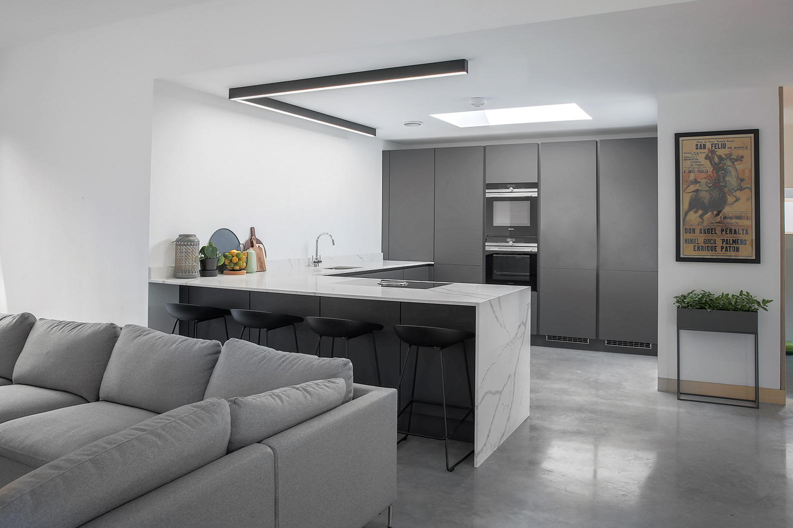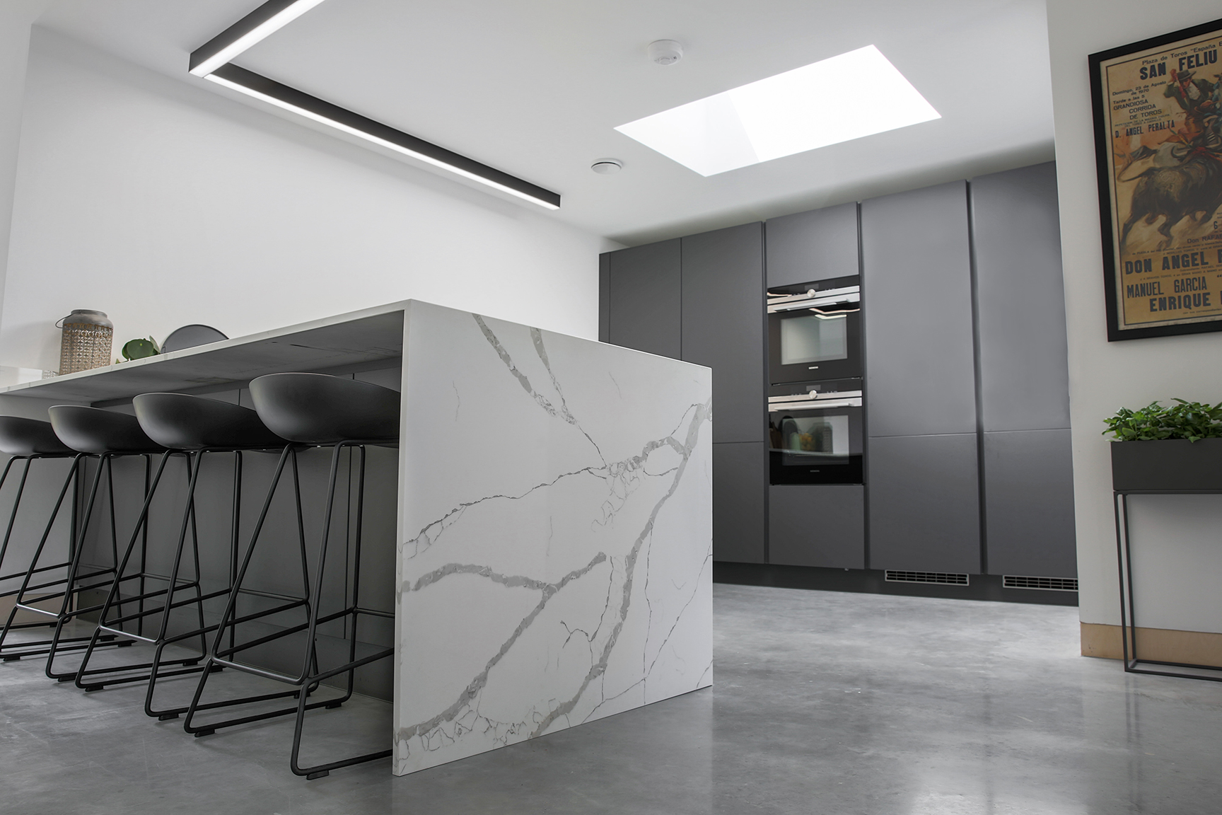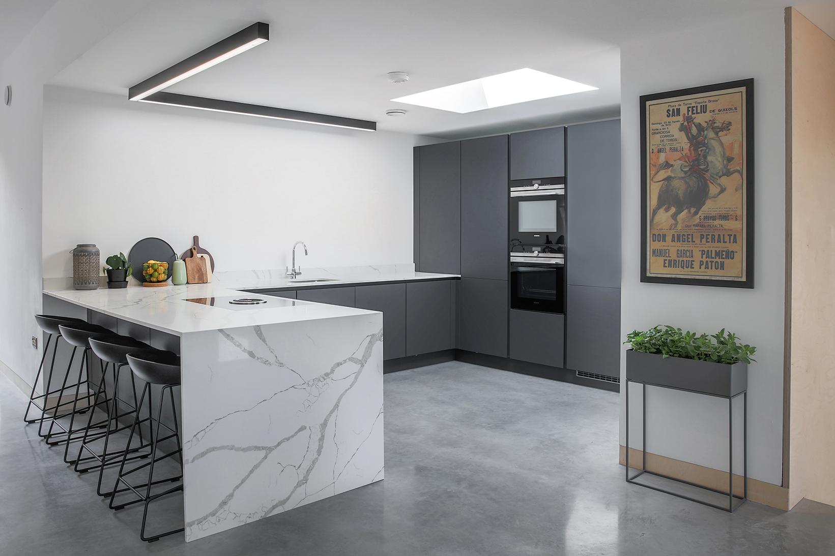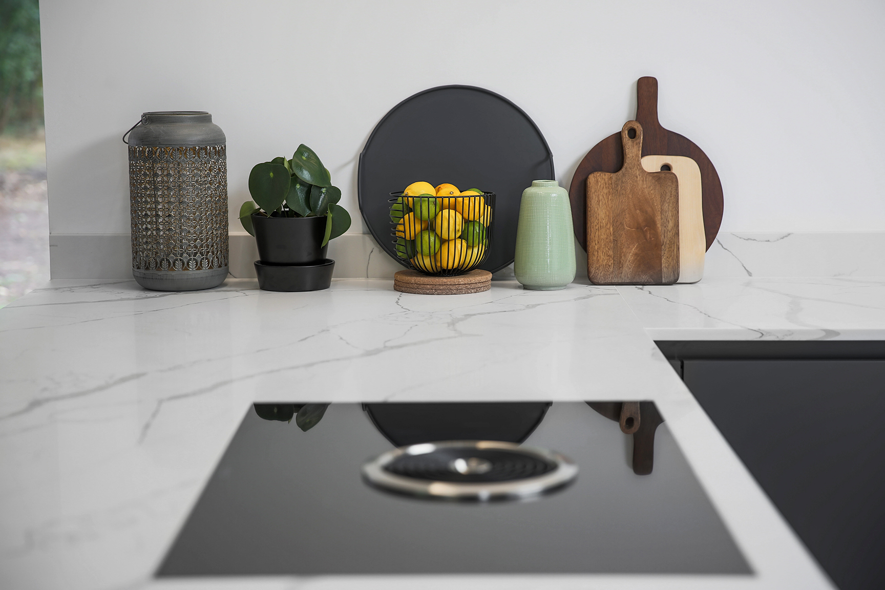Inspired by minimalist design, this carbon grey handle-less kitchen is the perfect addition to a contemporary lifestyle. Subtle and sleek, this design enjoys a unity of simple elements. From muted shades to neat lines, it represents the best of modern architecture.