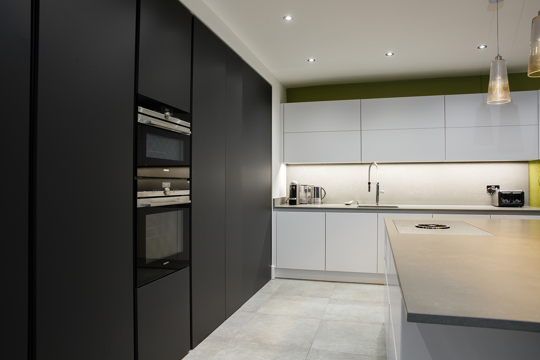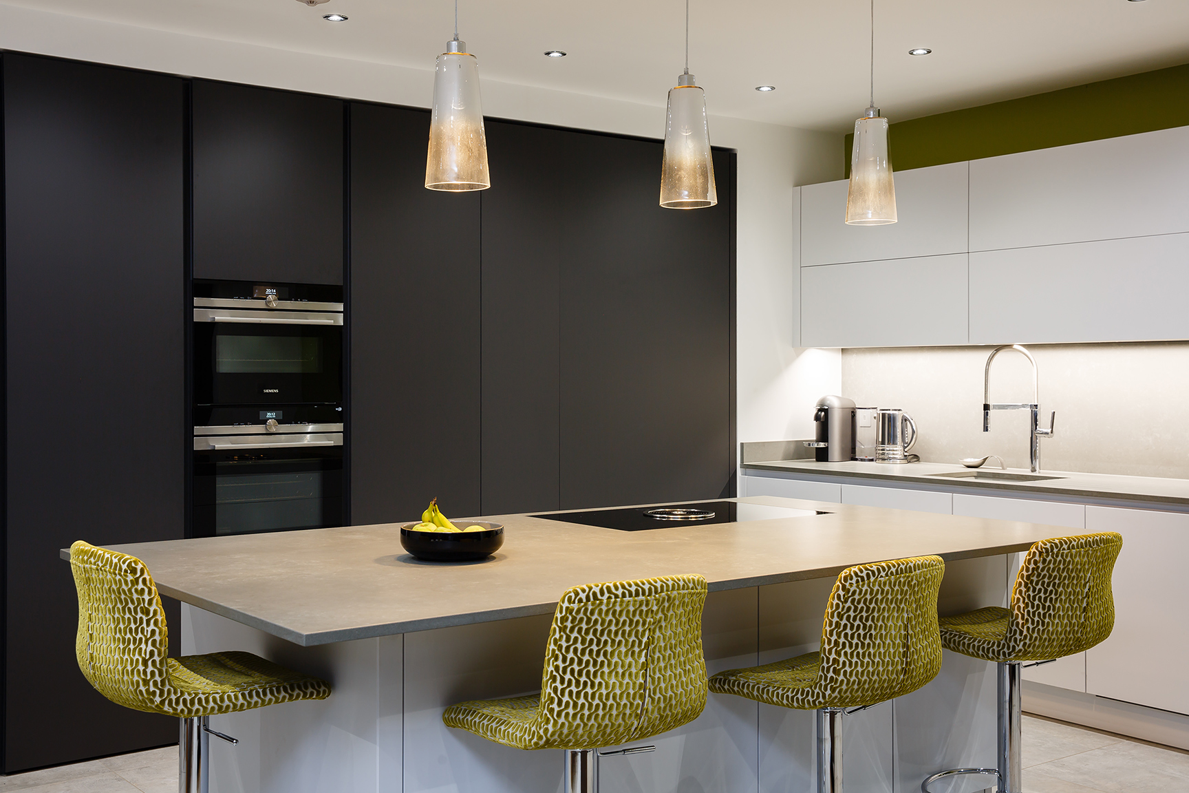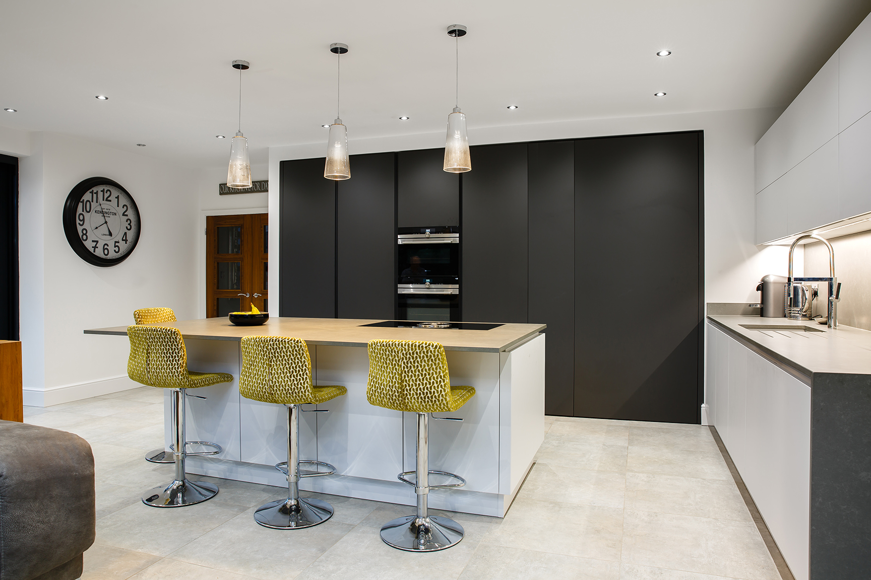 The use of bold shades lends a unique personality to your living space. The incorporation of a statement island with a breakfast bar makes this design ideal for a modern lifestyle. A utility area, concealed behind a series of closed shelves, is intrinsic to the functionality of the design.