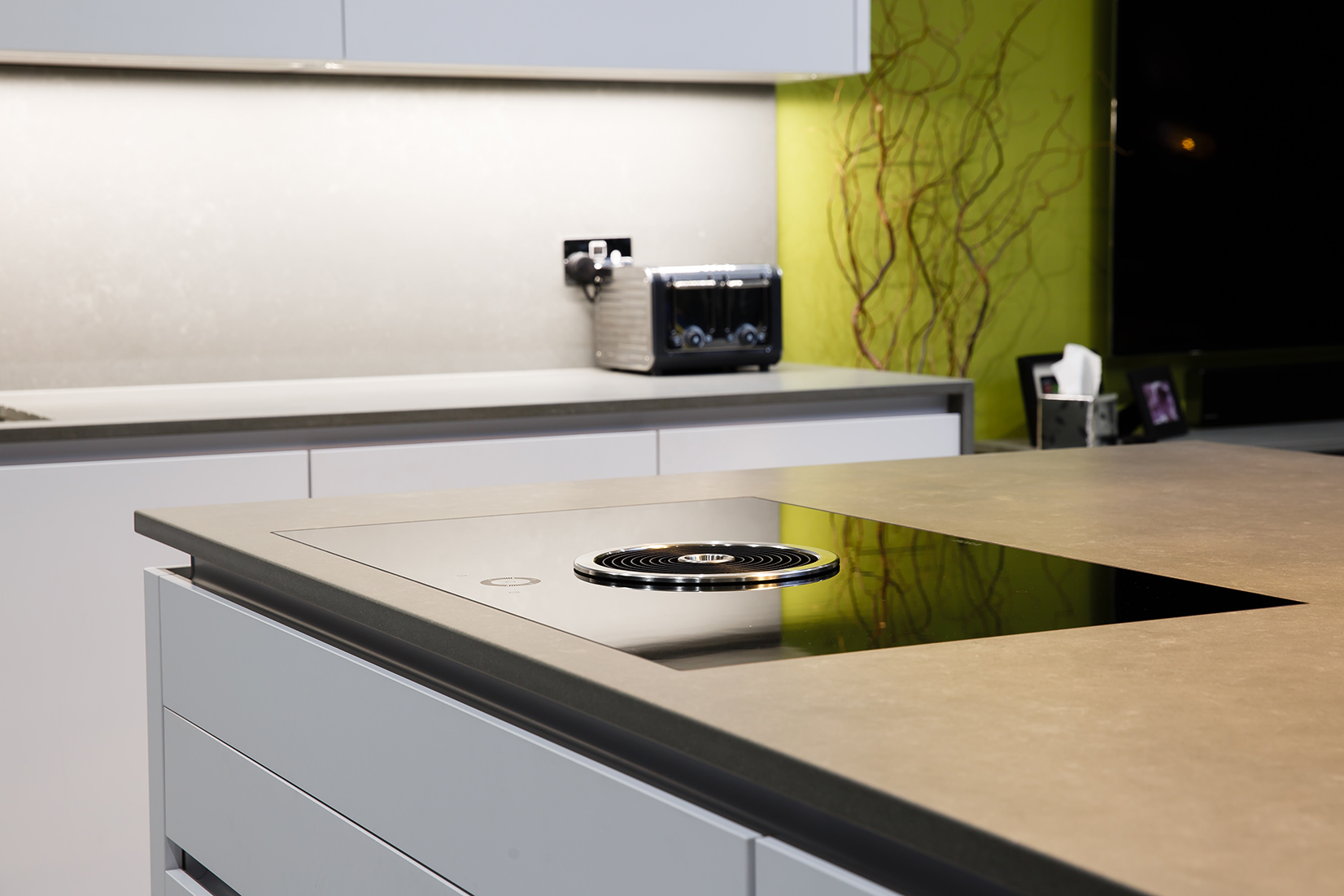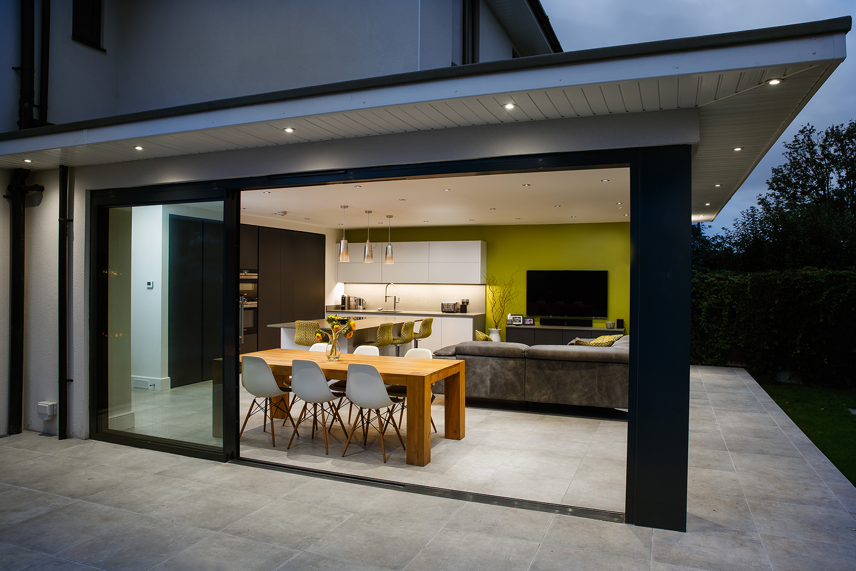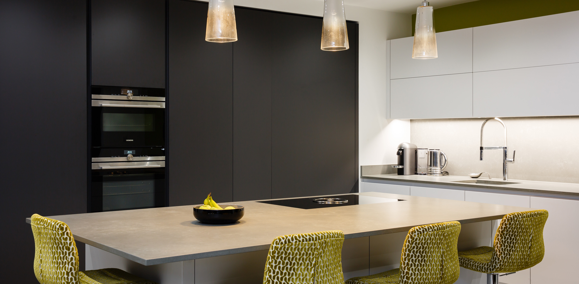 The use of bold shades lends a unique personality to your living space. The incorporation of a statement island with a breakfast bar makes this design ideal for a modern lifestyle. A utility area, concealed behind a series of closed shelves, is intrinsic to the functionality of the design.