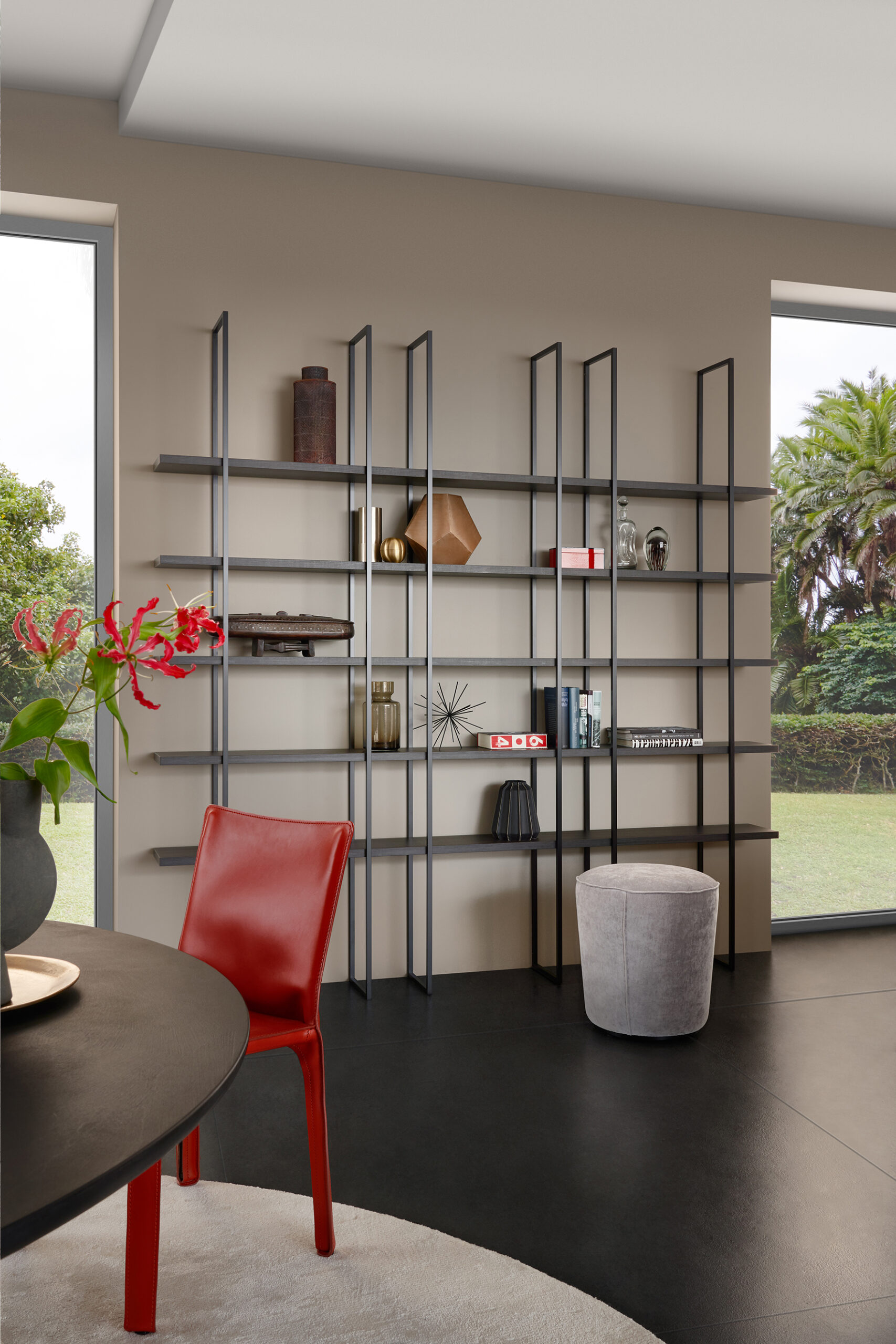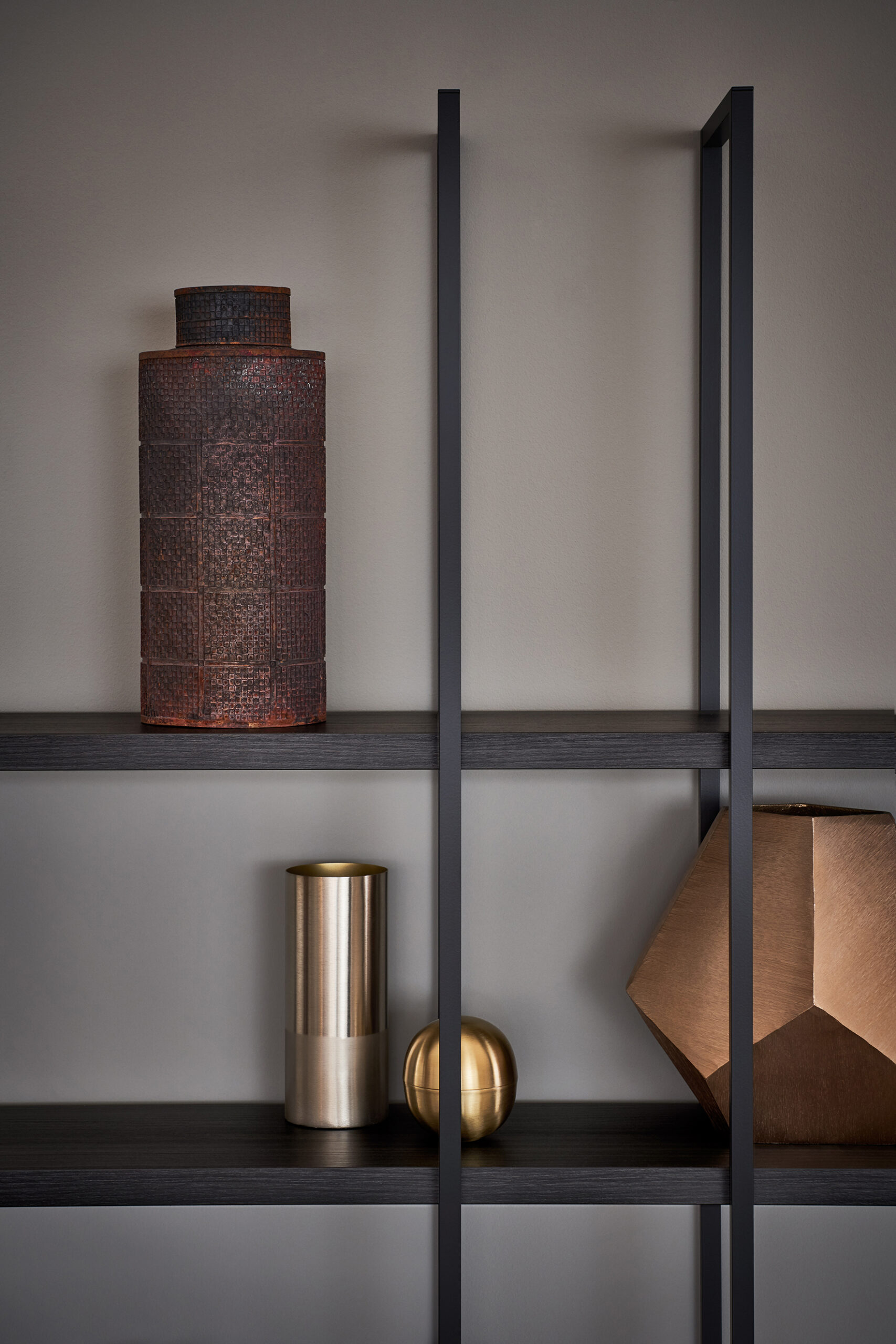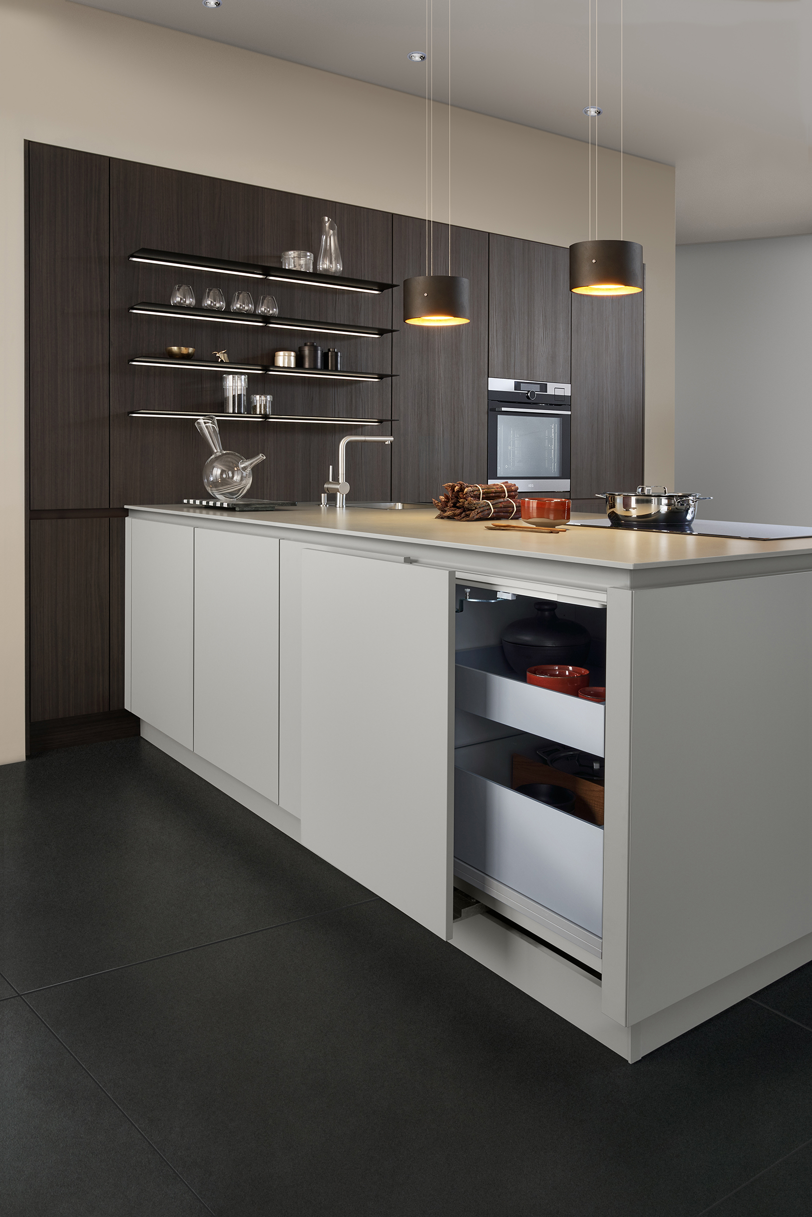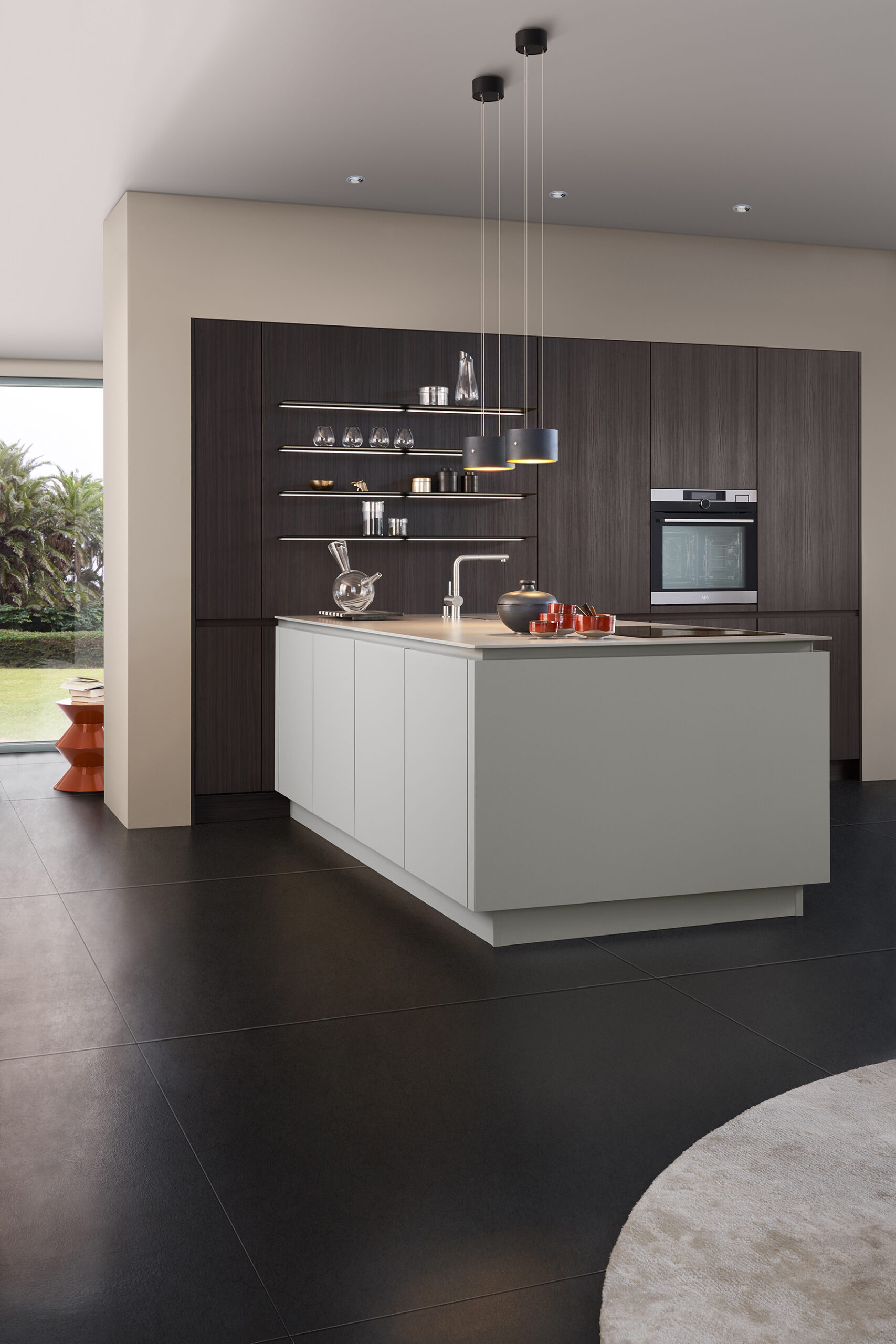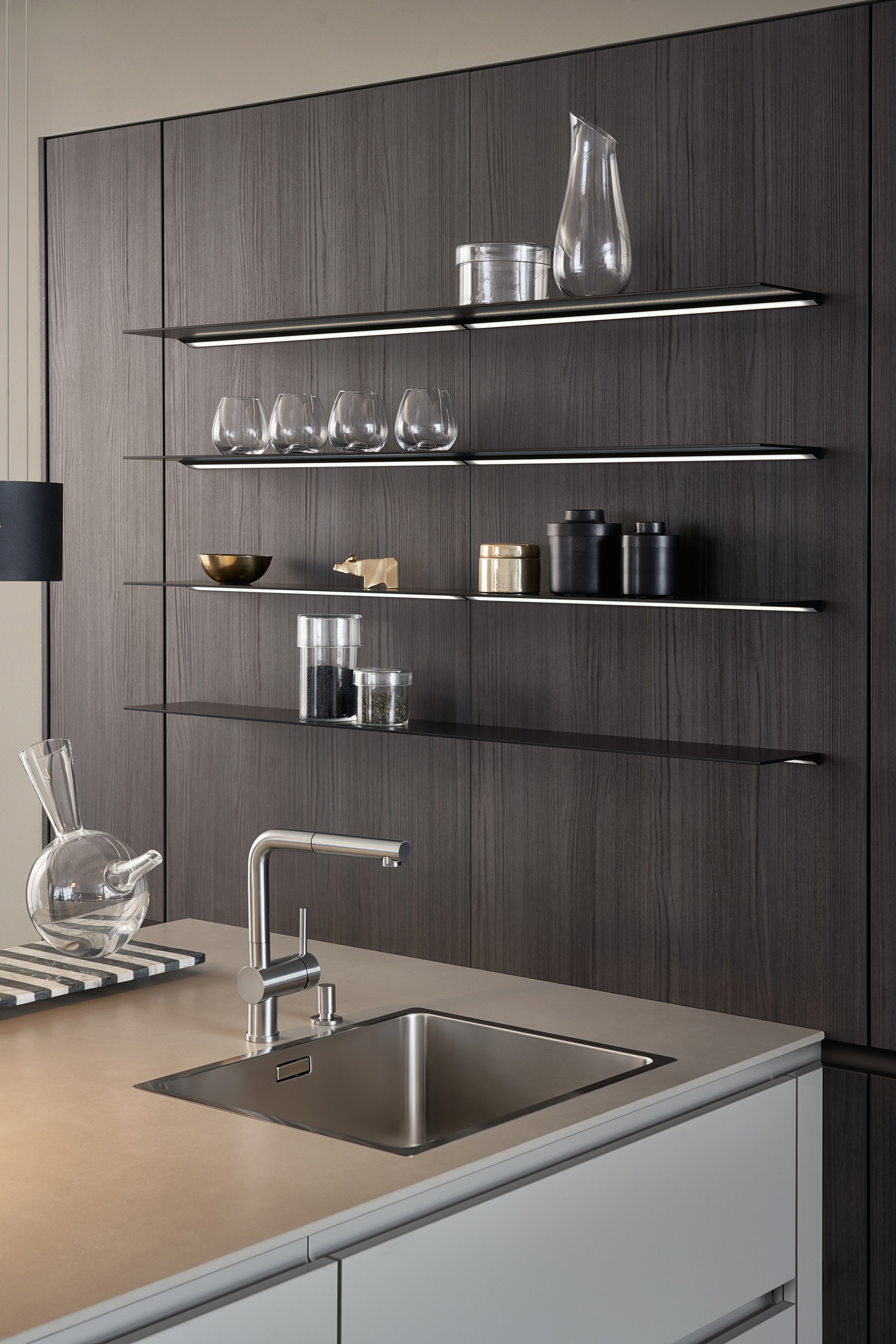The highly textured surface of the Mountain Robinia wooden front lends the furniture a natural quality. Combining harmoniously with olive grey, this design generates a unity of different forms and elements.