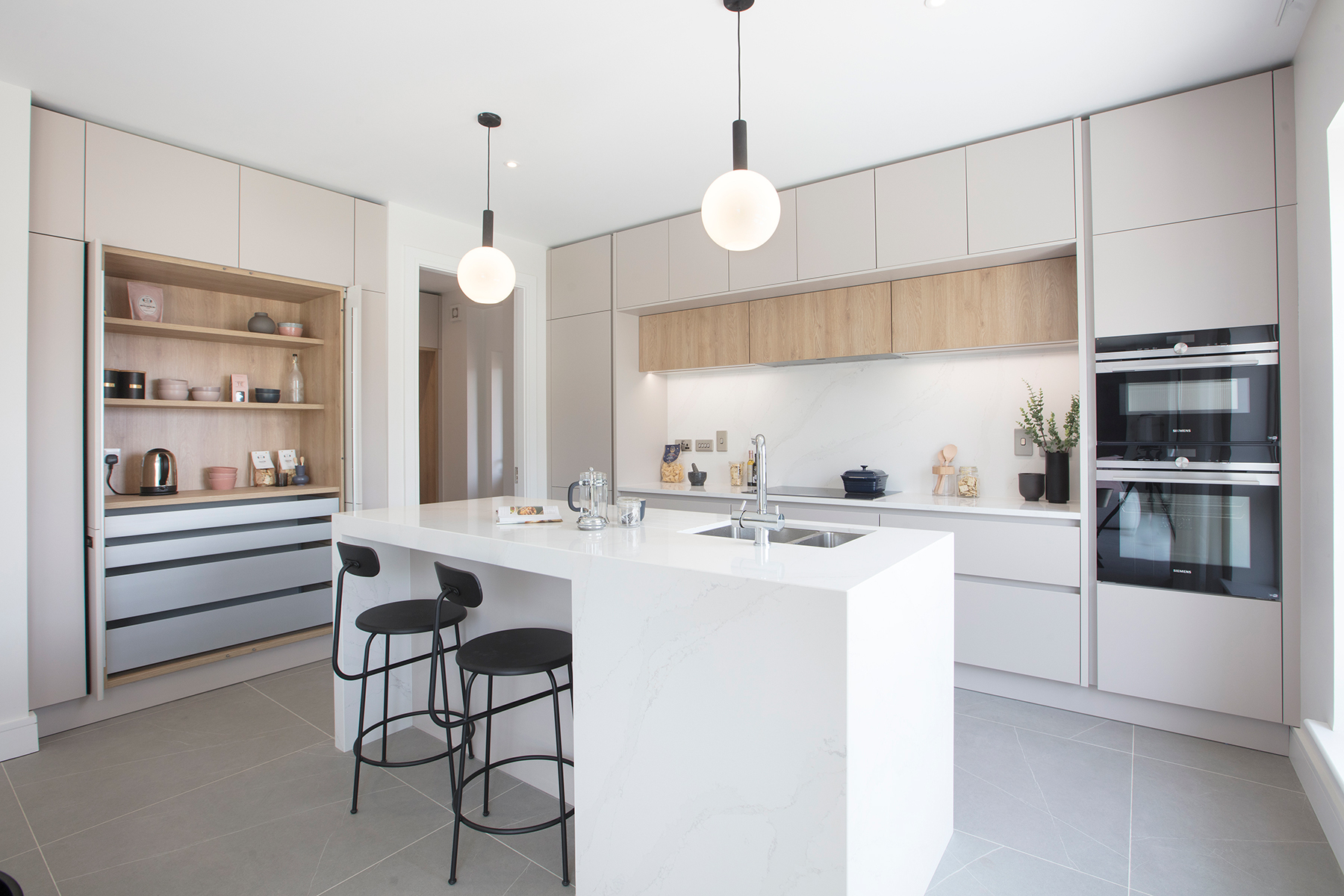 Contemporary living is a primary consideration in every detail of this design. The Leicht Bondi-C range in Mohair Super Matte is enhanced by muted wooden finishes. A pocket door system conceals both a storage area and a workstation.