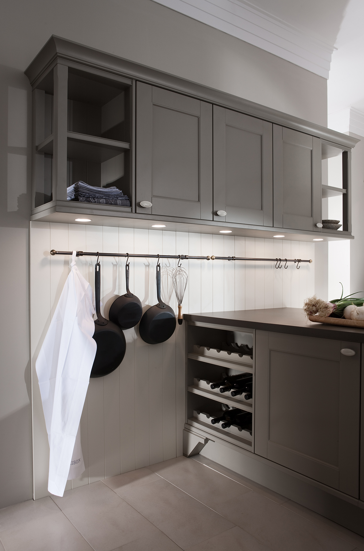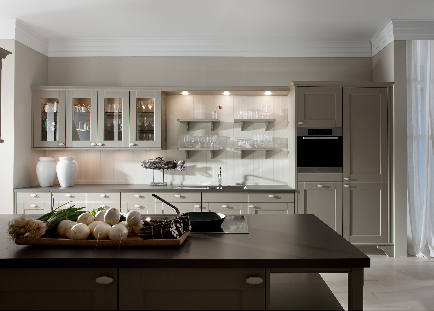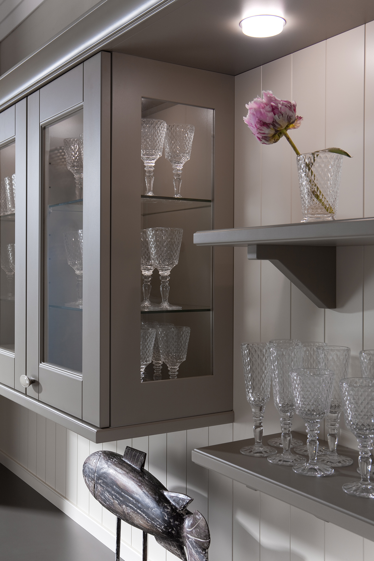 The Domus is a contemporary kitchen infused with traditional aesthetics. Modular shelving lends the design an element of unparalleled functionality. Subtle tones, varied textures, and framed shelving elevate the visual allure of the space.