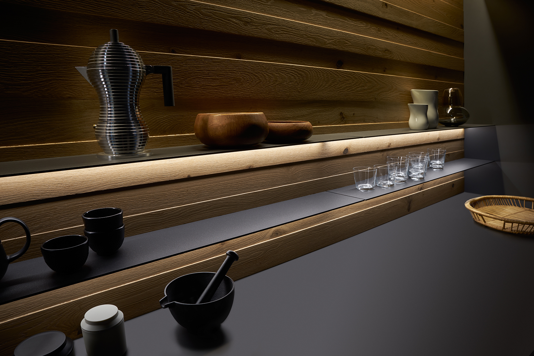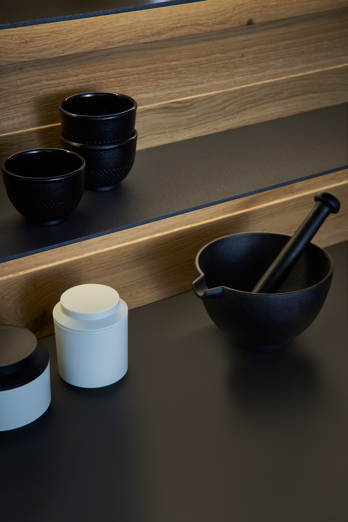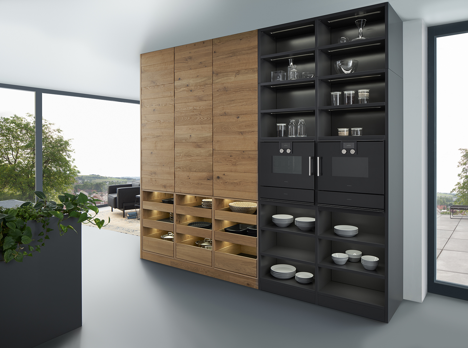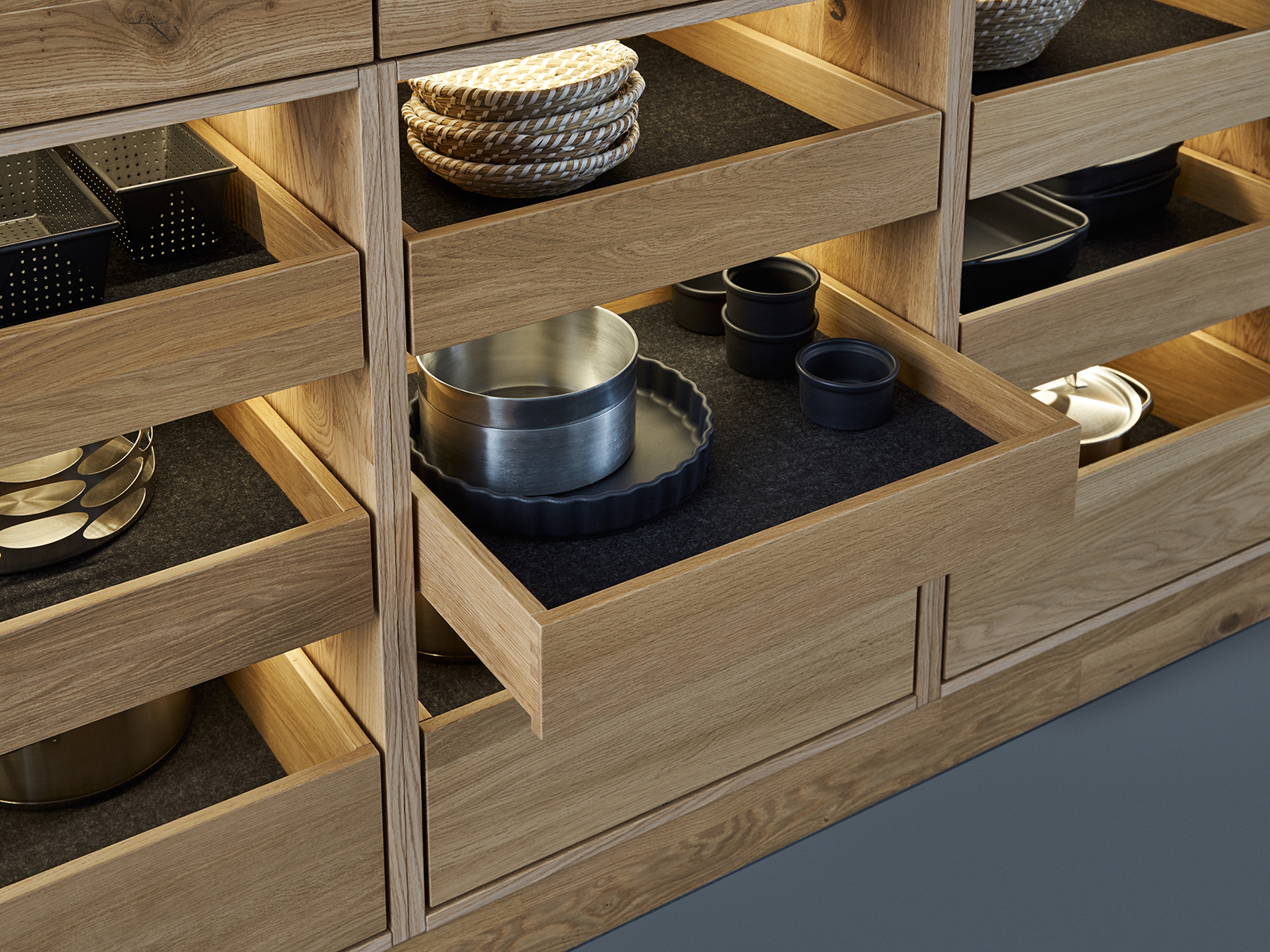 Structured wood with its warm tonality stands in deliberate contrast to the matte lacquer in cool carbon grey. The intermingling of different elements lends Bondi Valais an enticing feel. Semi-open drawers serve both aesthetic and functional purposes, imparting the design a distinctive quality.