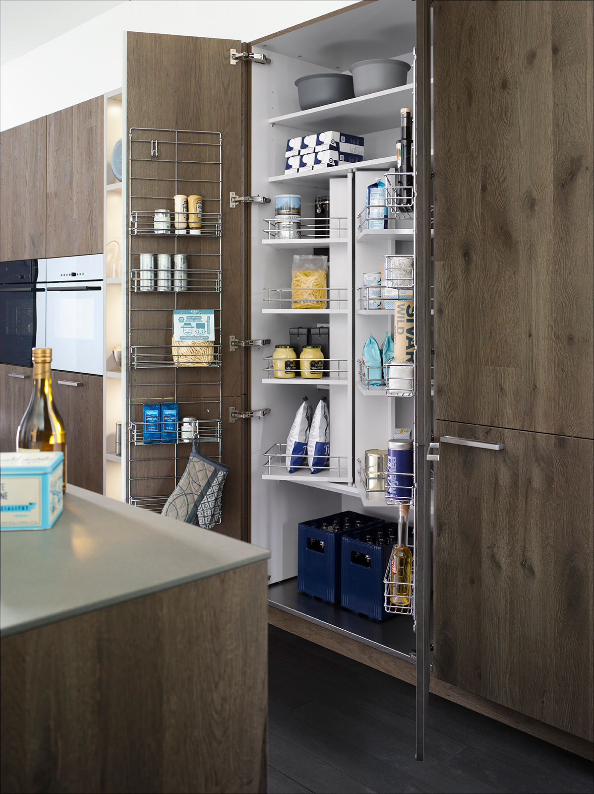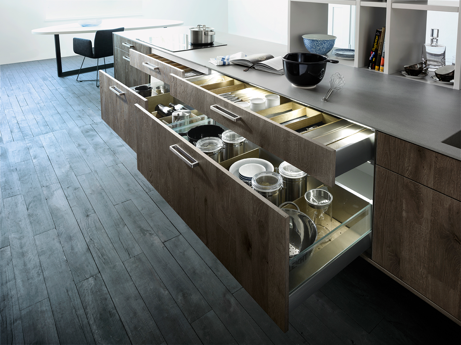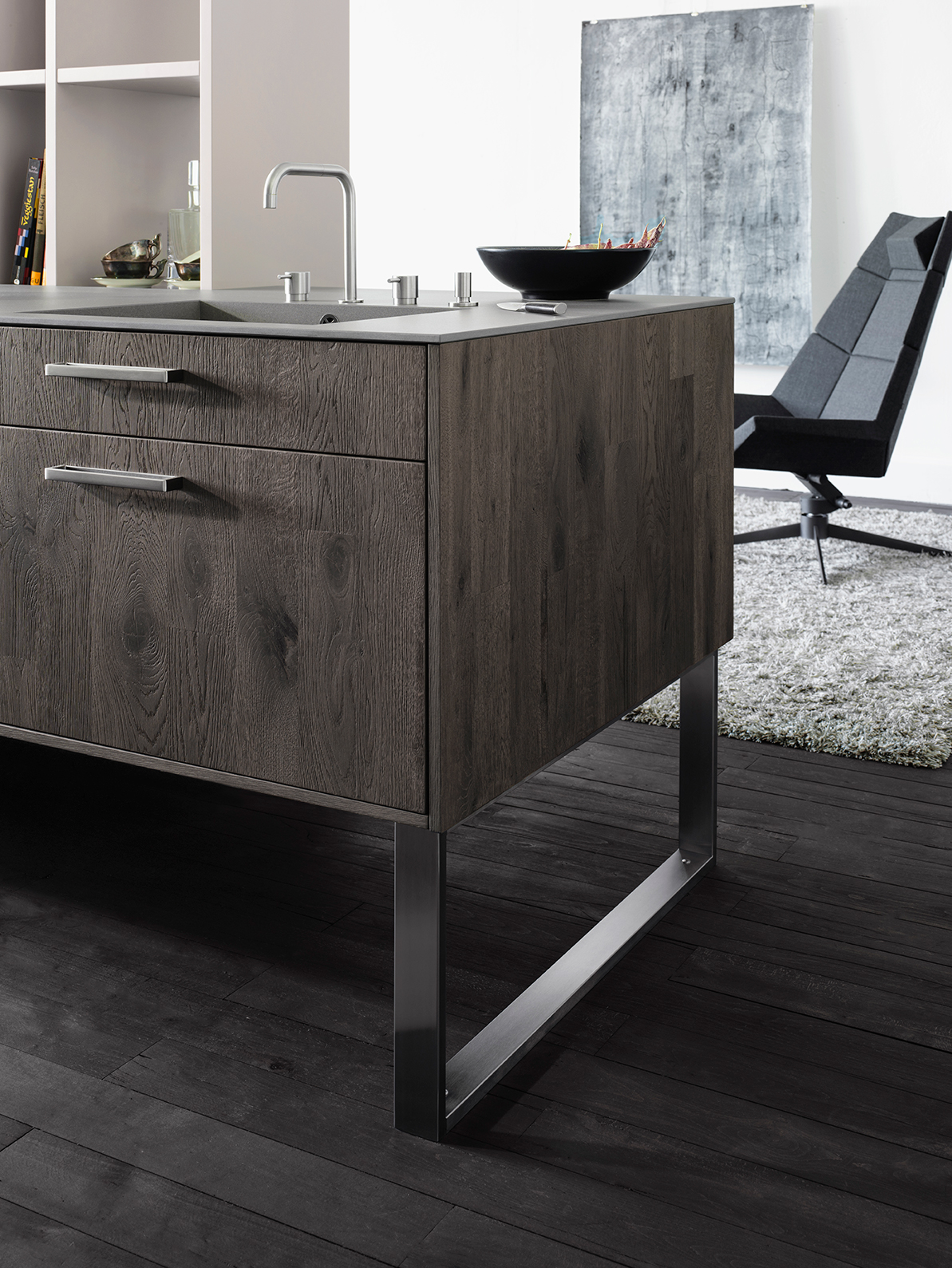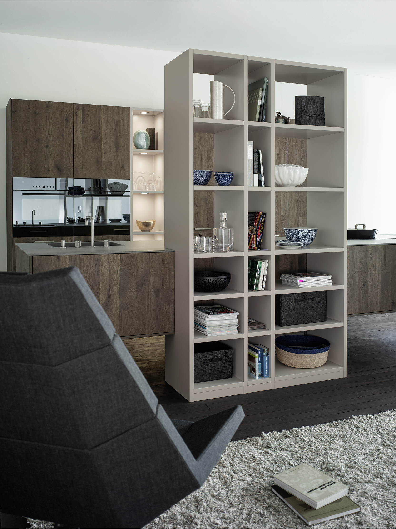 The textured wooden surface of the shelves is elegantly harmonised by a smooth matte finish on the attached open shelving unit. Pictured here in the oak slate colour, it is also available in natural, copper and moor finishes.