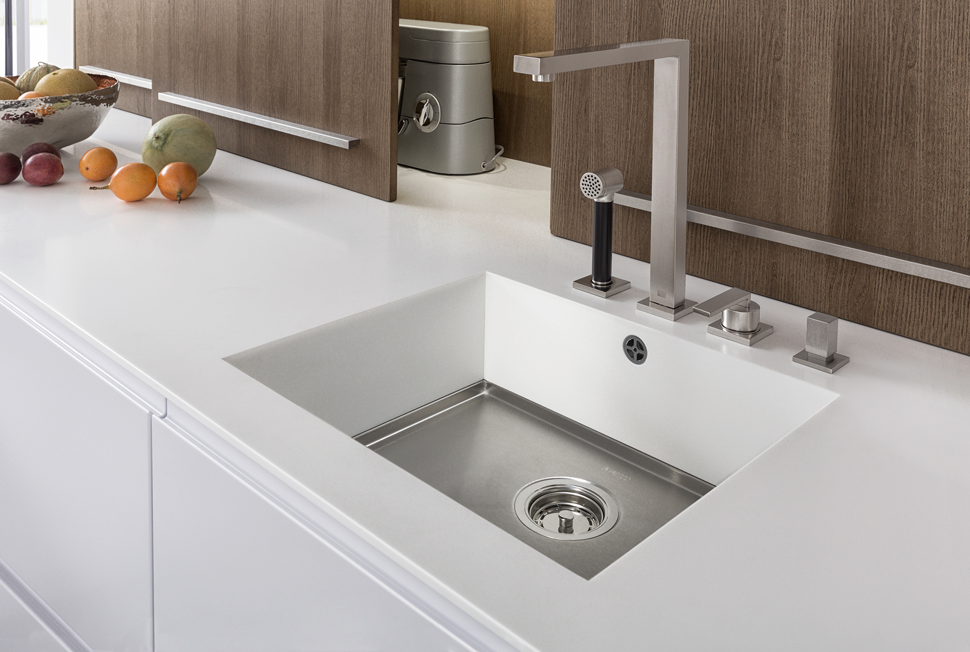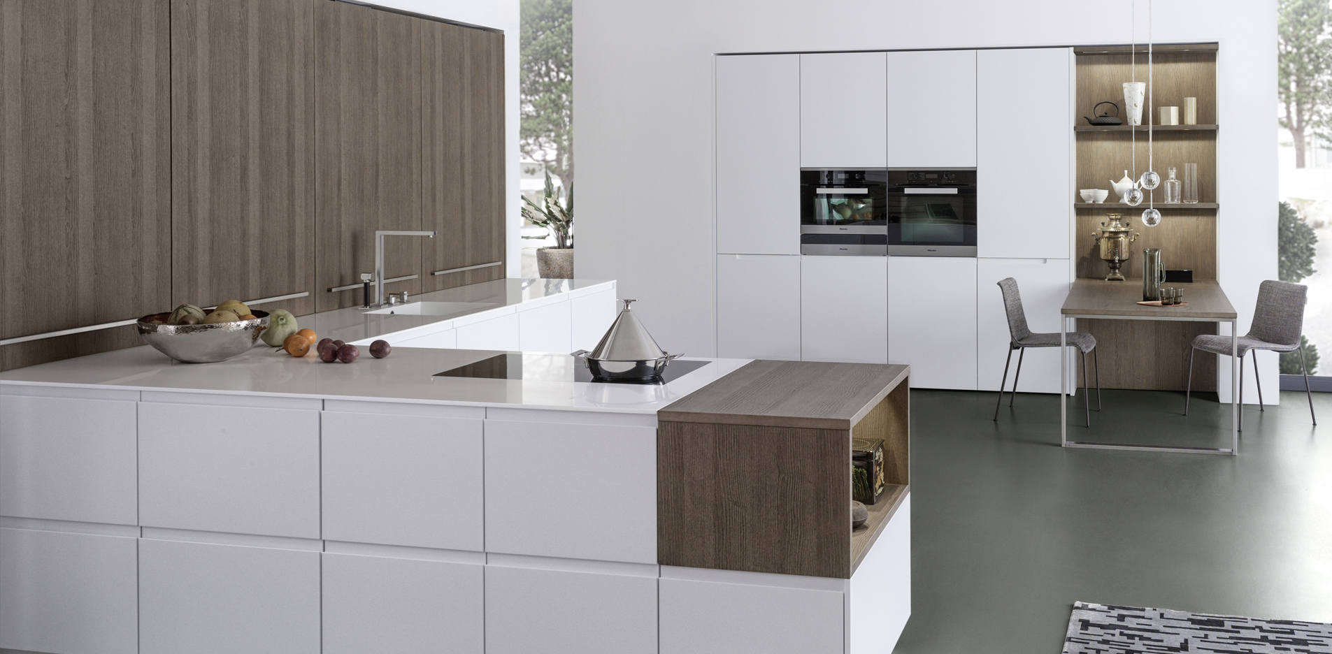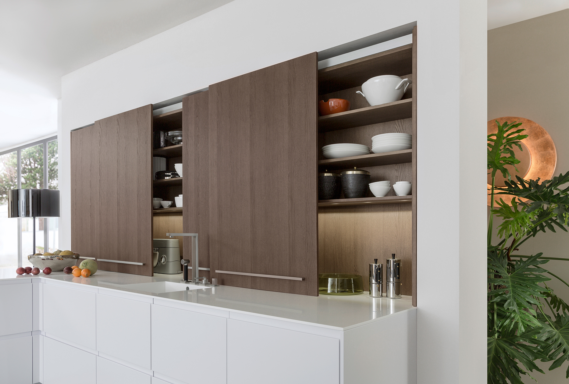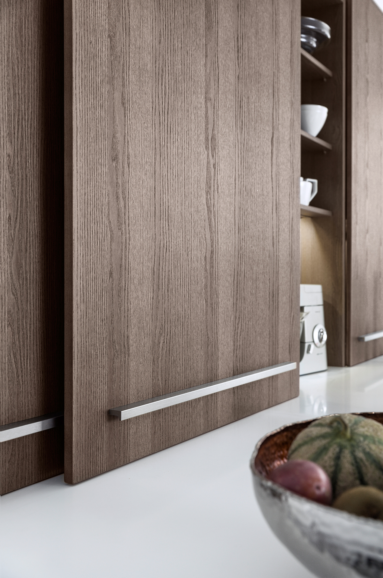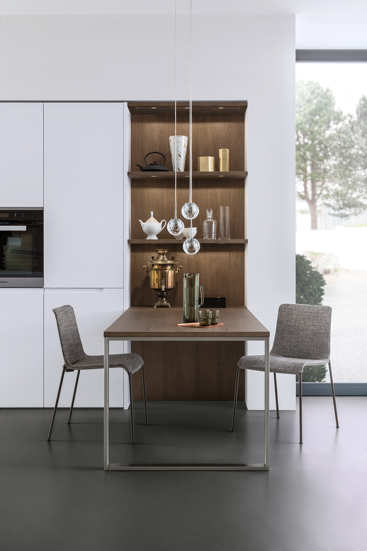 Authenticity, elegance, and efficiency are essential aspects of the modern kitchen. This is clearly exemplified by Pur FS & Topo. Madeira Ash veneer stained to a darker colour is perfect for warming up a white kitchen. Shelving systems, concealed by sliding doors, add an element of functionality.