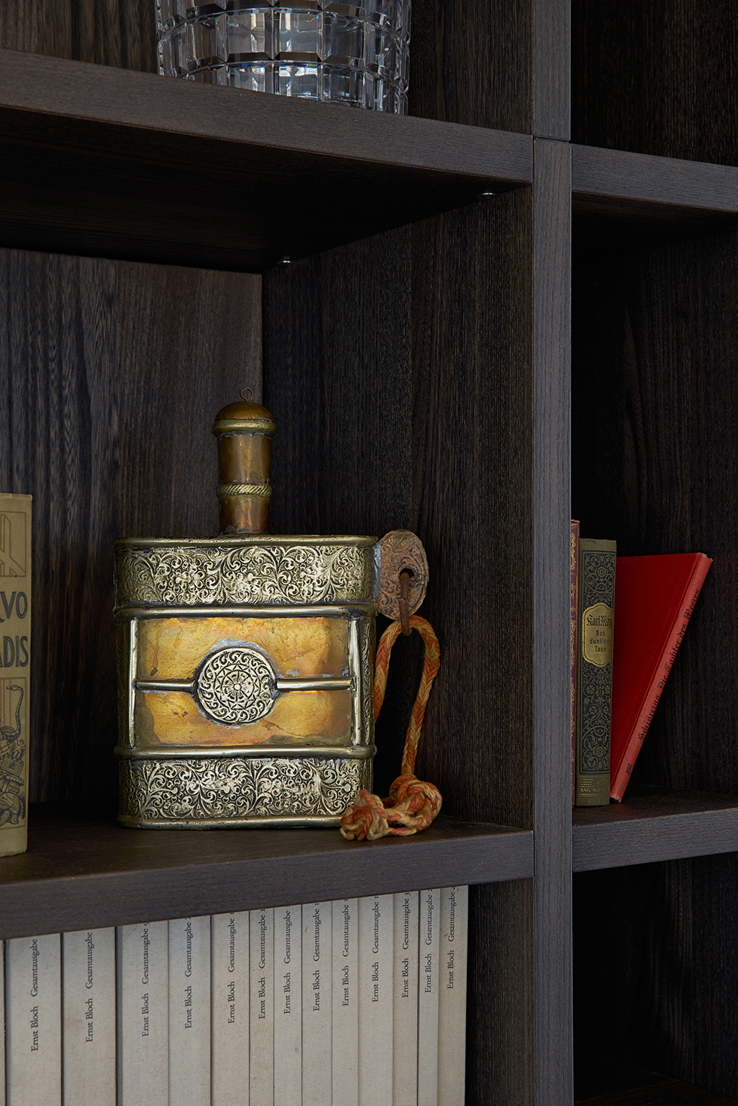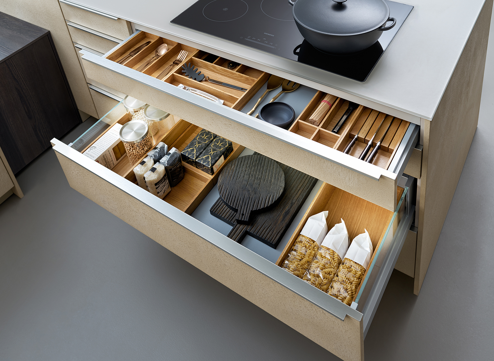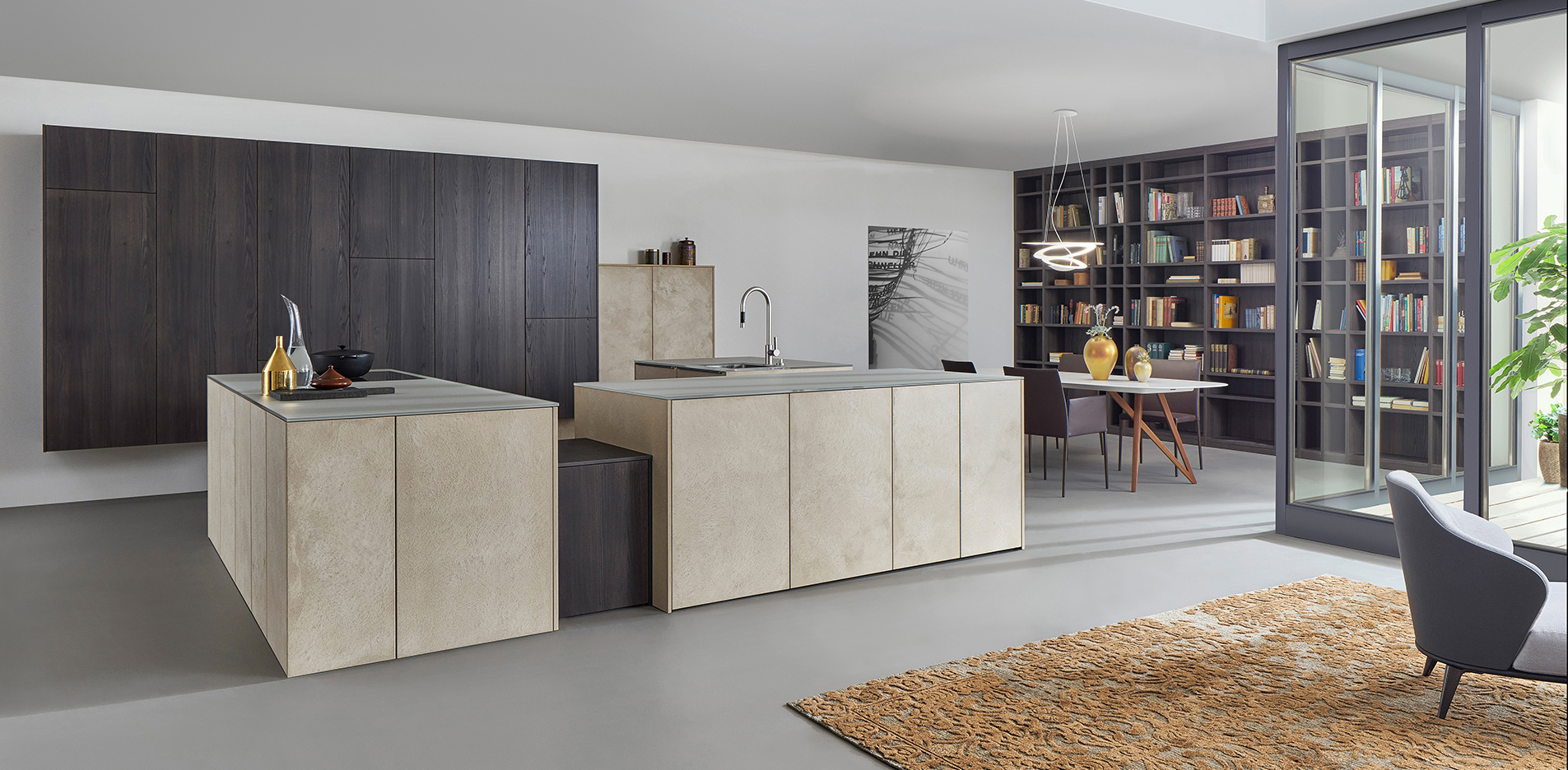 The combination of stone and dark wood creates a warm, welcoming space that is ideal for cooking and socialising. Enclosing a well-defined workspace, this design is ergonomically friendly and perfect for a modern home.