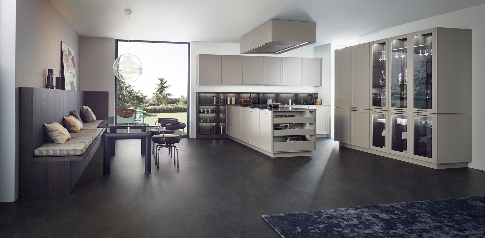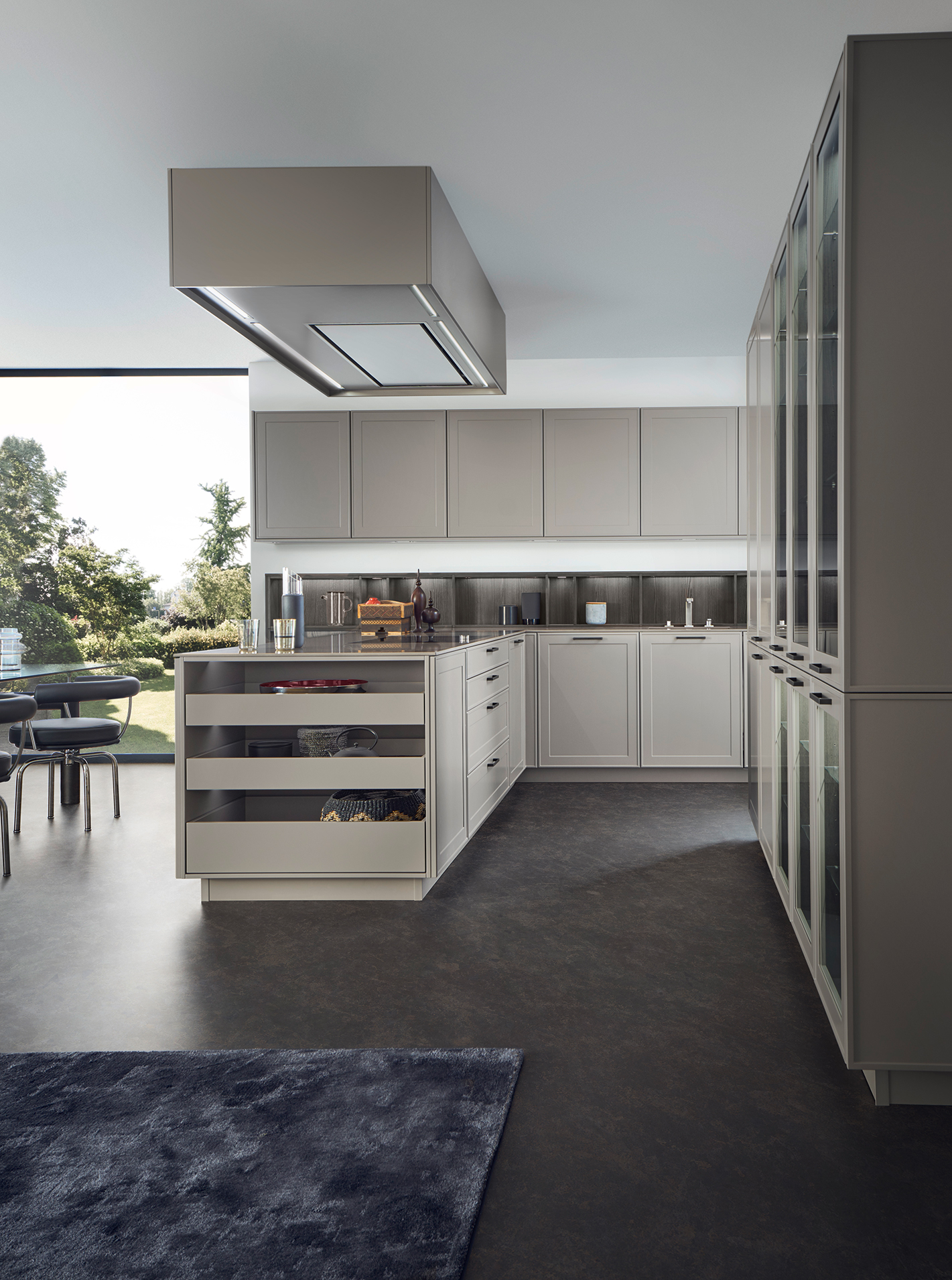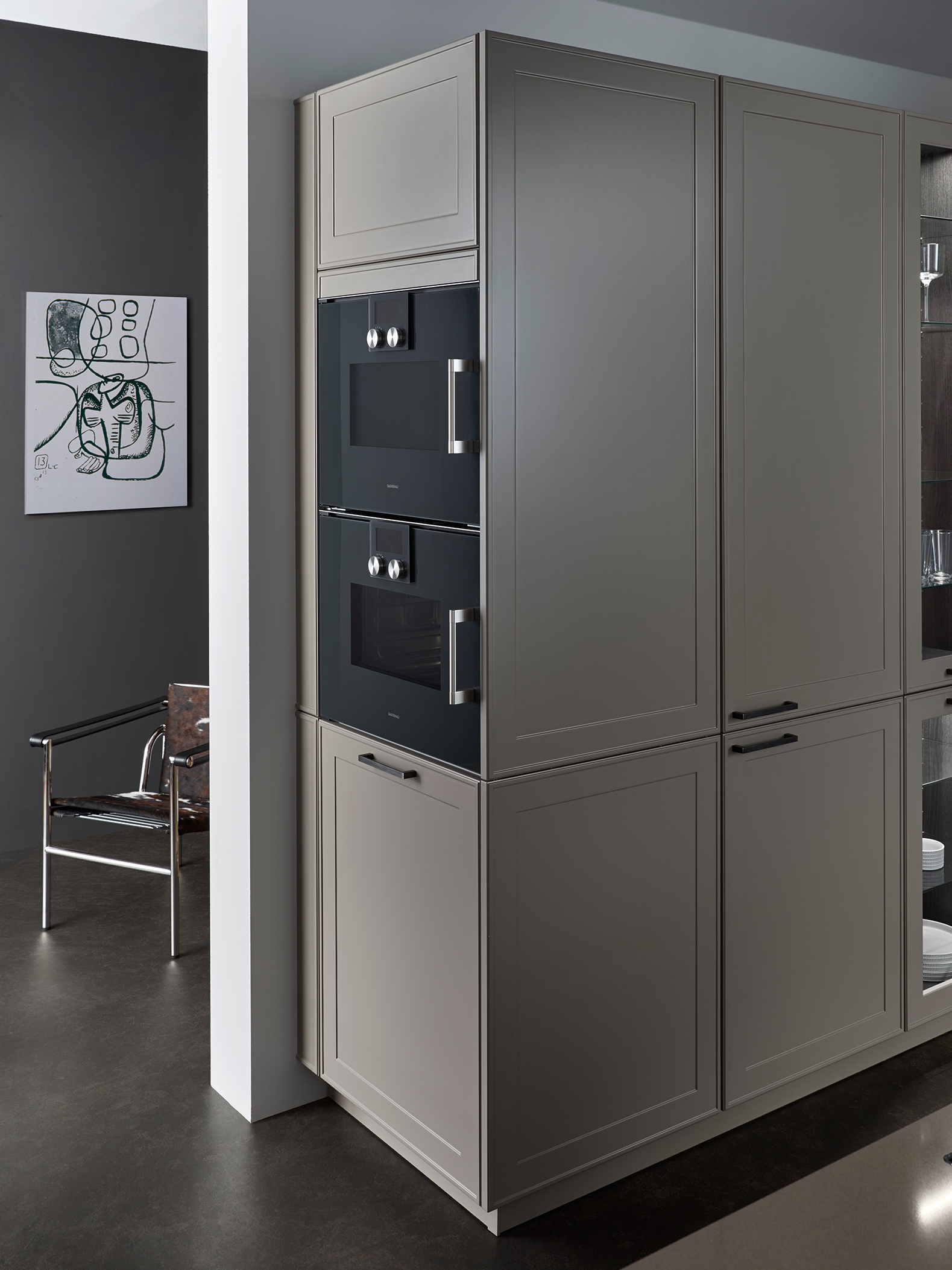 This aesthetically appealing, timelessly elegant kitchen’s atmosphere is characterised by its matte lacquered frame fronts from the Le Corbusier colour spectrum. Reminiscent of a traditional kitchen, this design has a distinct allure. The sleek door finishes are in Bergamo Elm and Ombre Naturelle Moyenne.