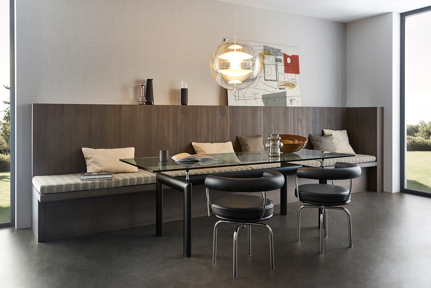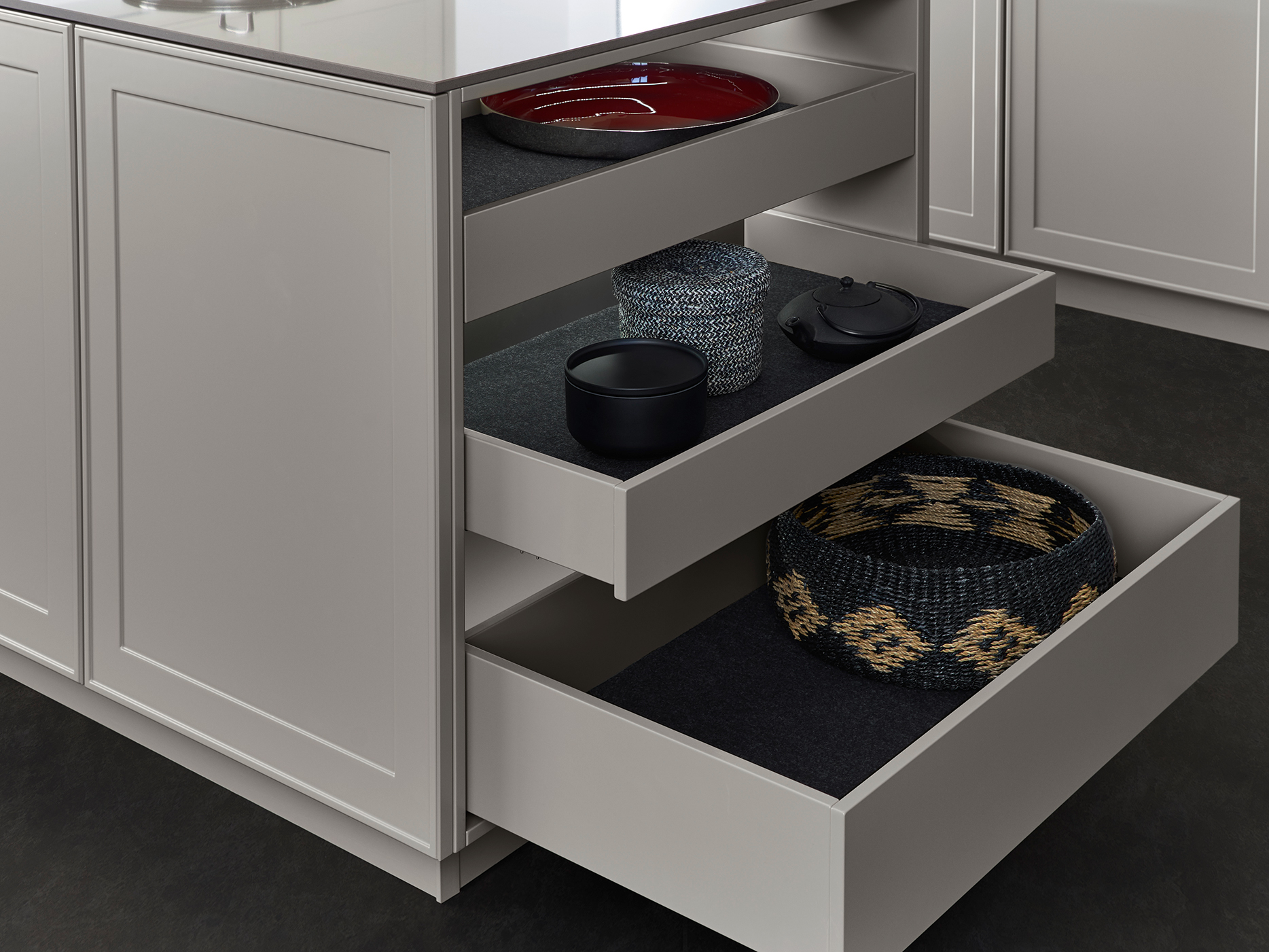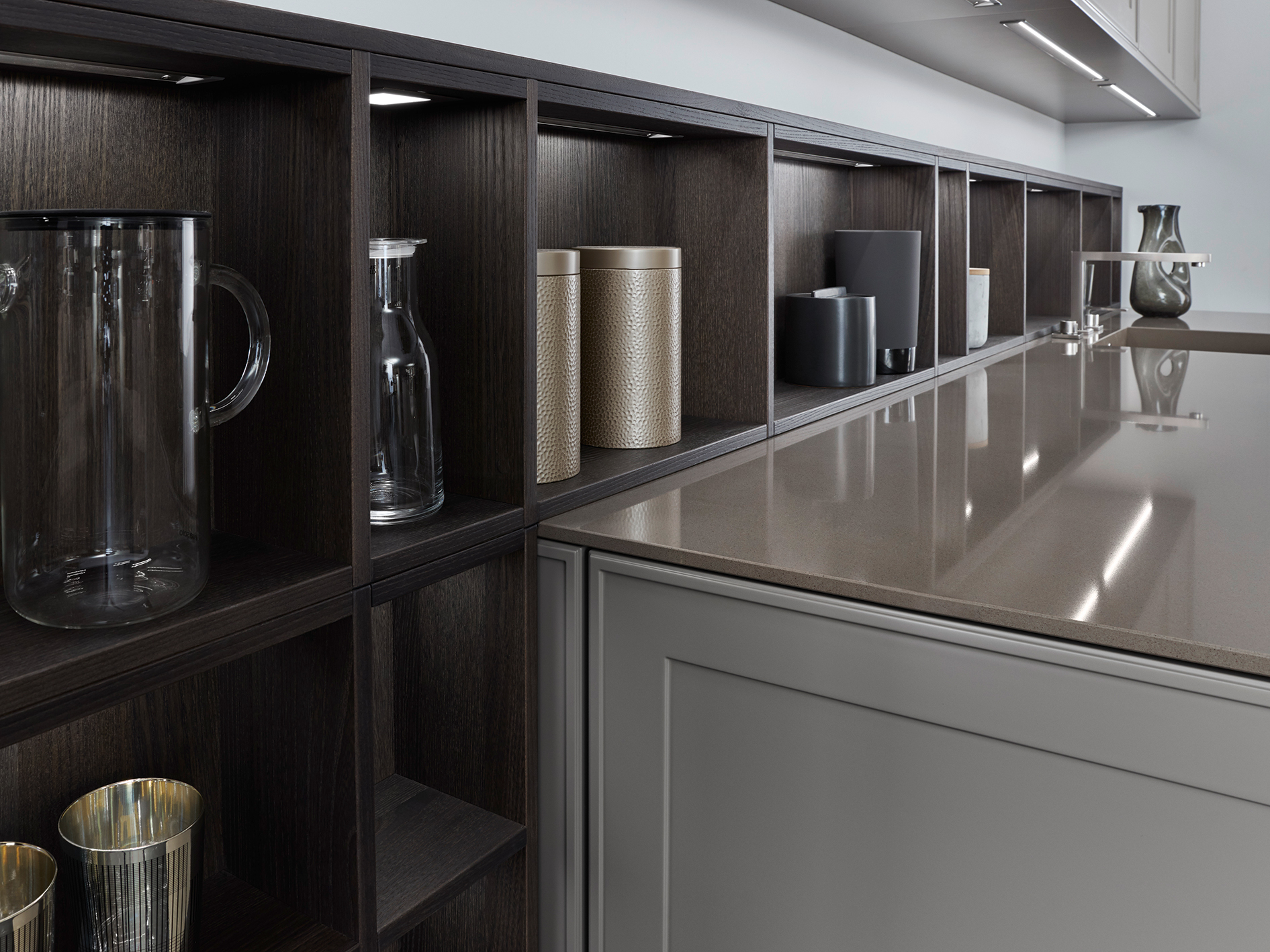 This aesthetically appealing, timelessly elegant kitchen’s atmosphere is characterised by its matte lacquered frame fronts from the Le Corbusier colour spectrum. Reminiscent of a traditional kitchen, this design has a distinct allure. The sleek door finishes are in Bergamo Elm and Ombre Naturelle Moyenne.
