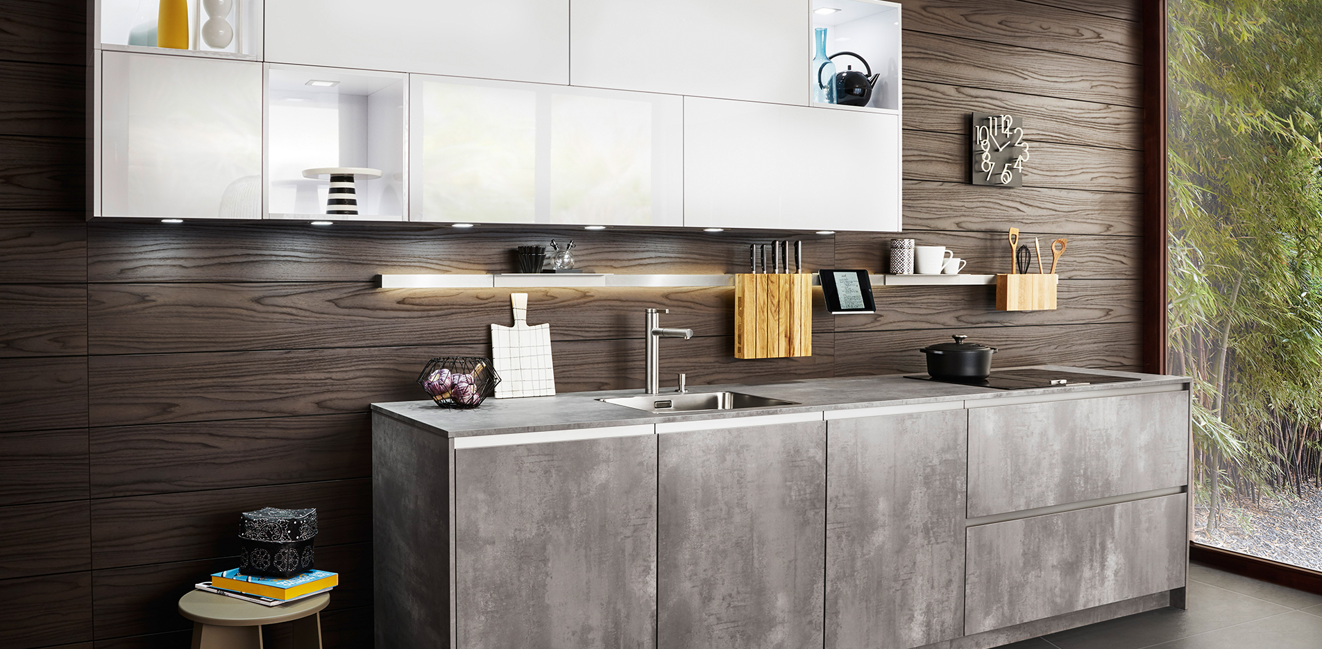 Use strong, textured and varied materials to bring your kitchen area to life. This smaller apartment style kitchen uses lots of key elements from the Leicht product range from McNally Living, to produce a kitchen which ticks all the boxes for functionality while making a bold statement in looks. Mixing materials: – wood, concrete and gloss white, completes the kitchen with a warm and textured finish. The wooden wall panel is fitted floor to ceiling and incorporates a delicately illuminated, integrated accessory rail, which holds knives, cook books and other cooking utensils. Eye-catching grey concrete base units flow into the contrasting white gloss wall units. The streamlined white is then dotted with some open shelving for display. Our in-house design consultants would be delighted to assist with your kitchen finishes, drop in or book a design consultation today..