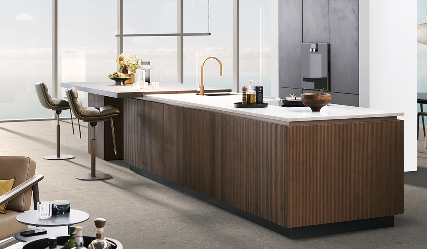 BOSSA features an authentic wood facade that imparts a unique texture throughout. Its design includes a sleek, handleless island unit complete with a built-in seating arrangement. The use of walnut wood for the BOSSA range exudes a cosy ambiance and adds a subtle three-dimensional appearance to this elegant kitchen.