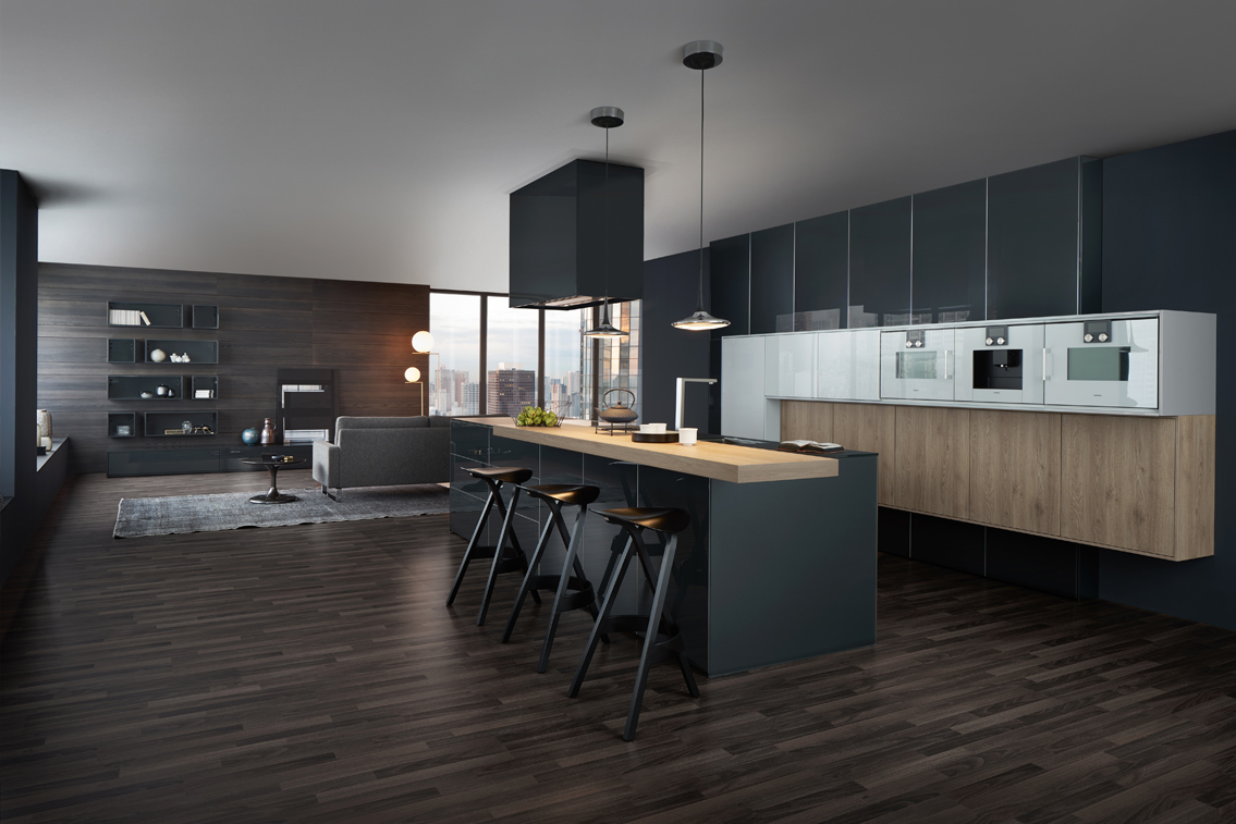 The striking and convenient L-shaped design and top-quality surfaces make this kitchen a bold eye-catcher. Frosted glass contrasts with elegant lacquer, a discreet metal look with warm wood, and smart storage solutions reveal a rhythmic kitchen architecture.