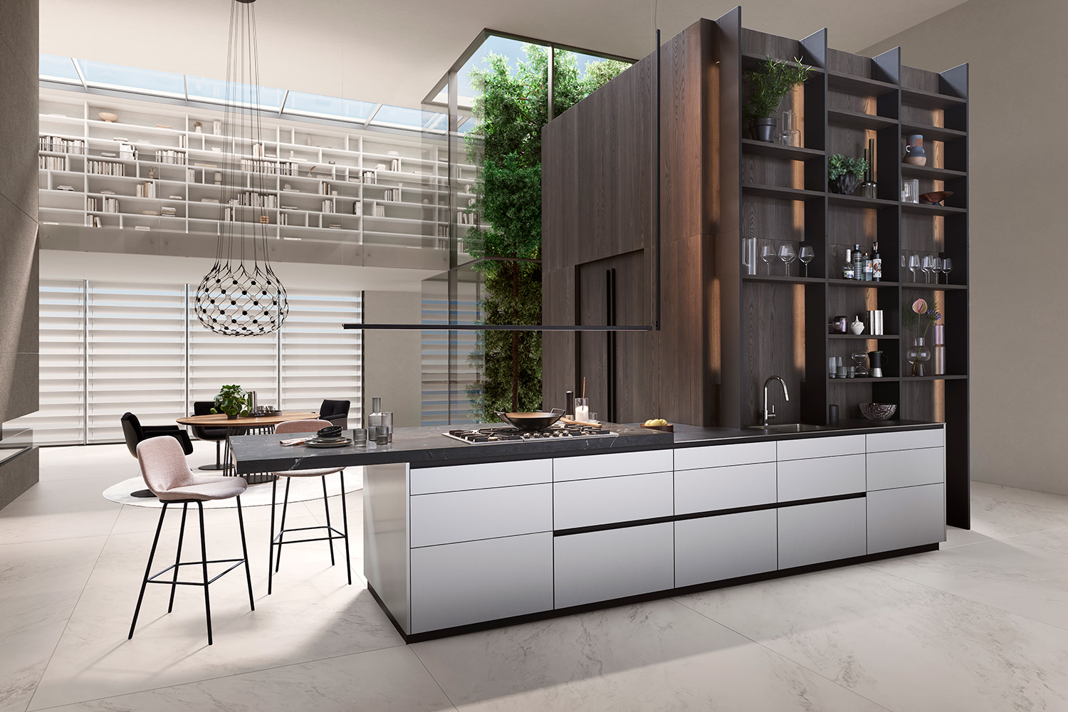 This handleless kitchen maximises CONTINO 12’s elegant flair. It includes tall units and vertical shelf sides of the ICONIC open shelving system, which has been installed directly against a free-standing room in the bergamo ulme version. Access to this elegant walk-in utility room can be planned either with sliding doors or access doors with a lacquer finish or in aluminium.