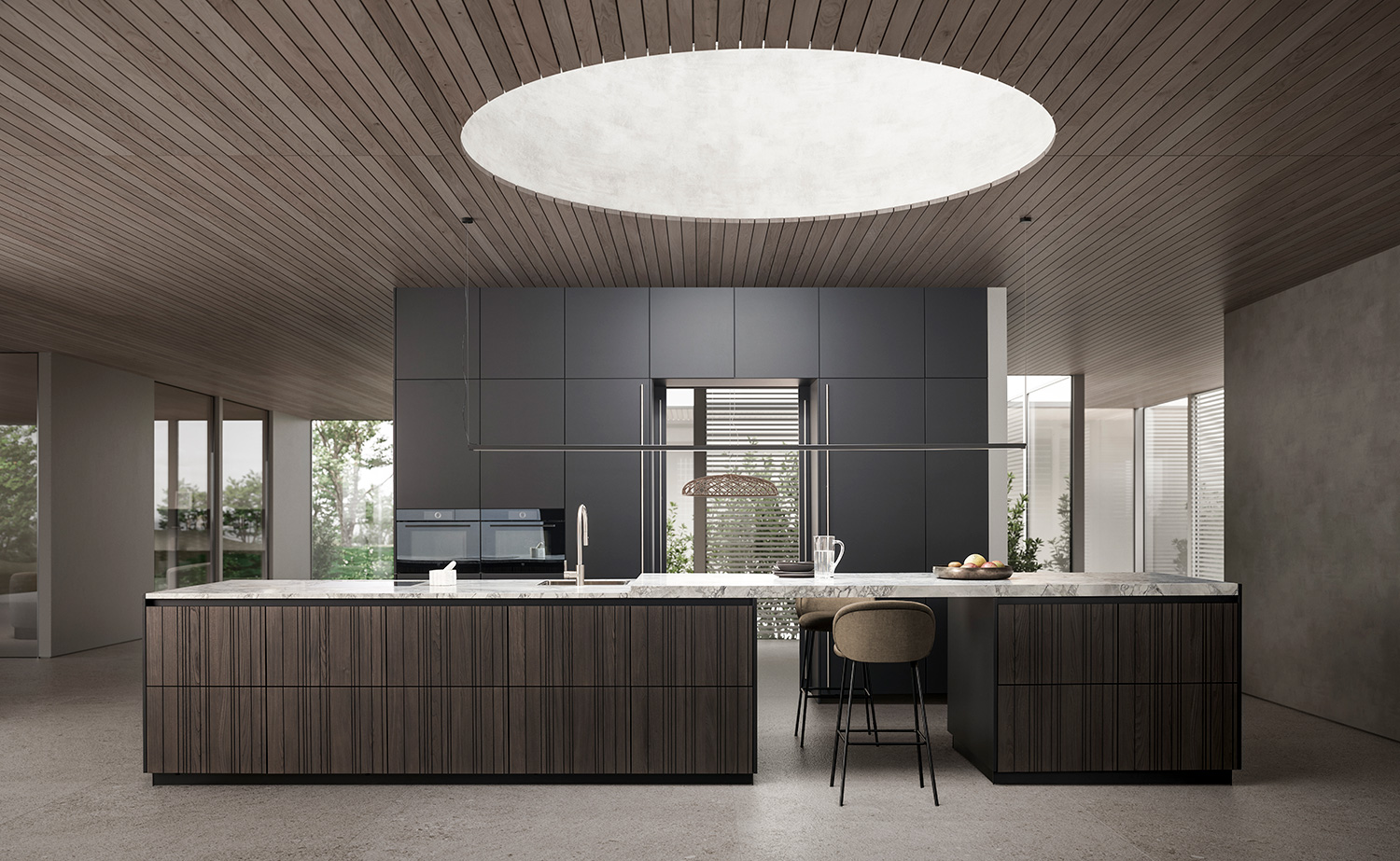 The latest innovation consists of a veneer front with an exciting surface created by its vertical groove structure. BAHIA thus draws on LEICHT’s successful surface programme BOSSA, but is different in a key design principle: in addition to the contrast between the raised surface and the grooves themselves, the special feature of BAHIA is the combination of two apparent opposites. Within any one front, the individual grooves are set asymmetrically to each other, but in the sequence of several fronts, an identical fanning structure emerges.
