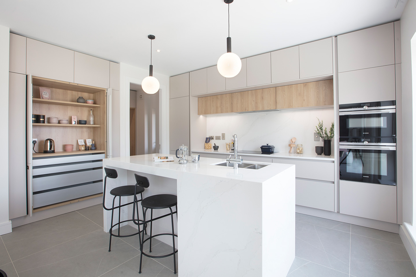 This kitchen is enhanced by the use of Leicht Bondi-C range in Mohair Super Matte throughout, accented with muted wooden finishes. A pocket door system conceals a minimalistic workstation and facilitates the kitchen flow.