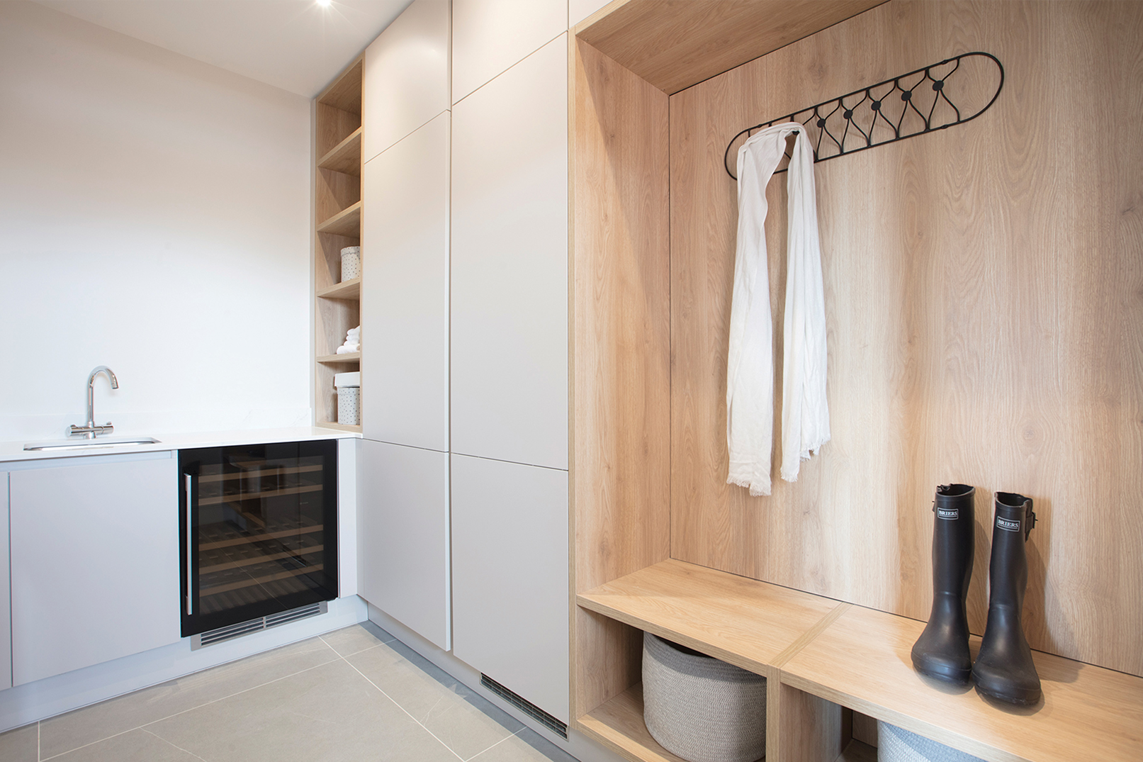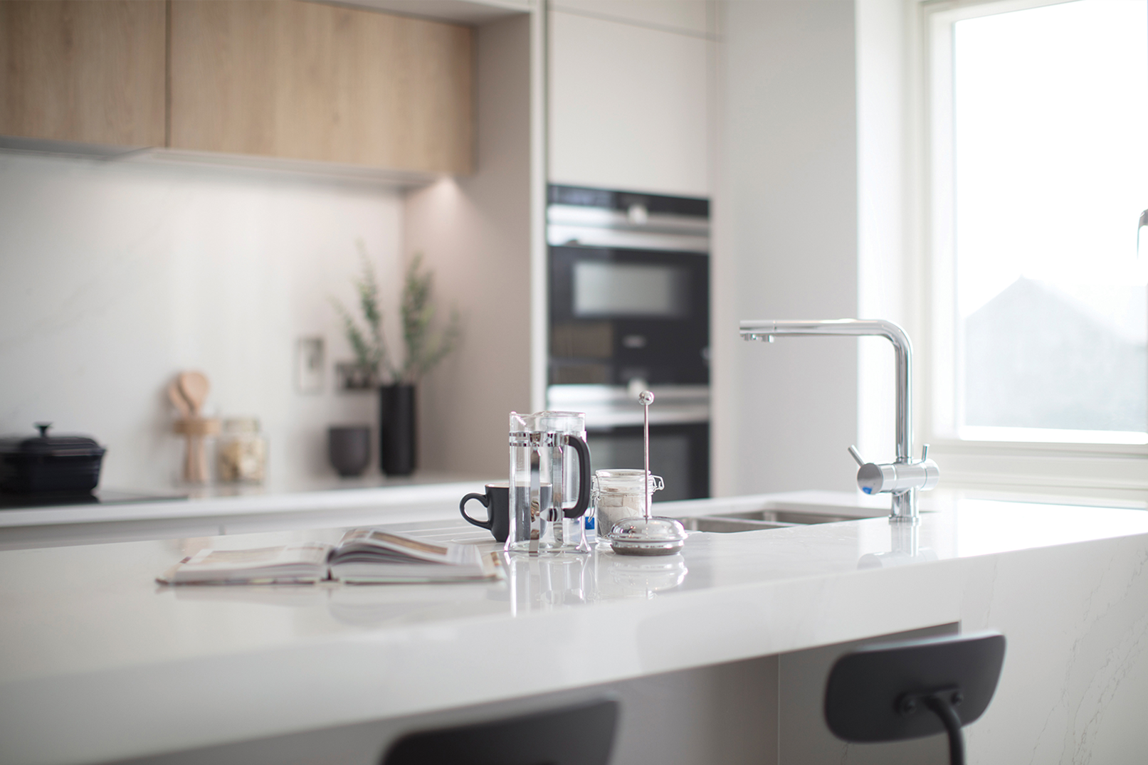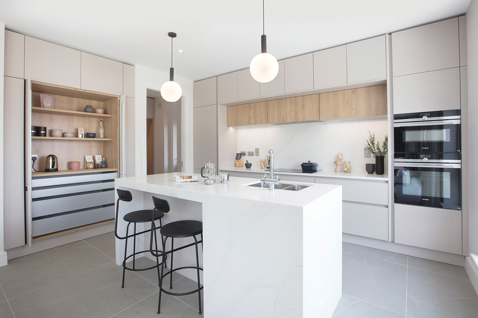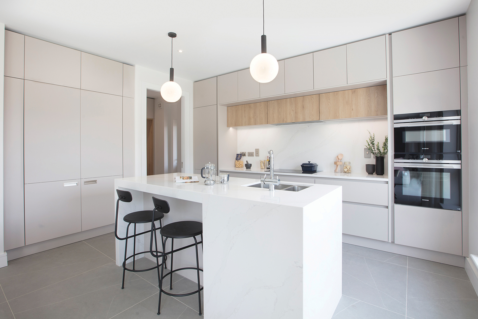 This showhouse kitchen is from the Leicht Bondi-C range in Mohair Super Matte, paired with Highland Oak in the Synthia-C range. This tasteful design has a smooth uncluttered look with its handleless doors. A Flex induction hob along with integrated Siemens appliances make the kitchen as functional as it is attractive.